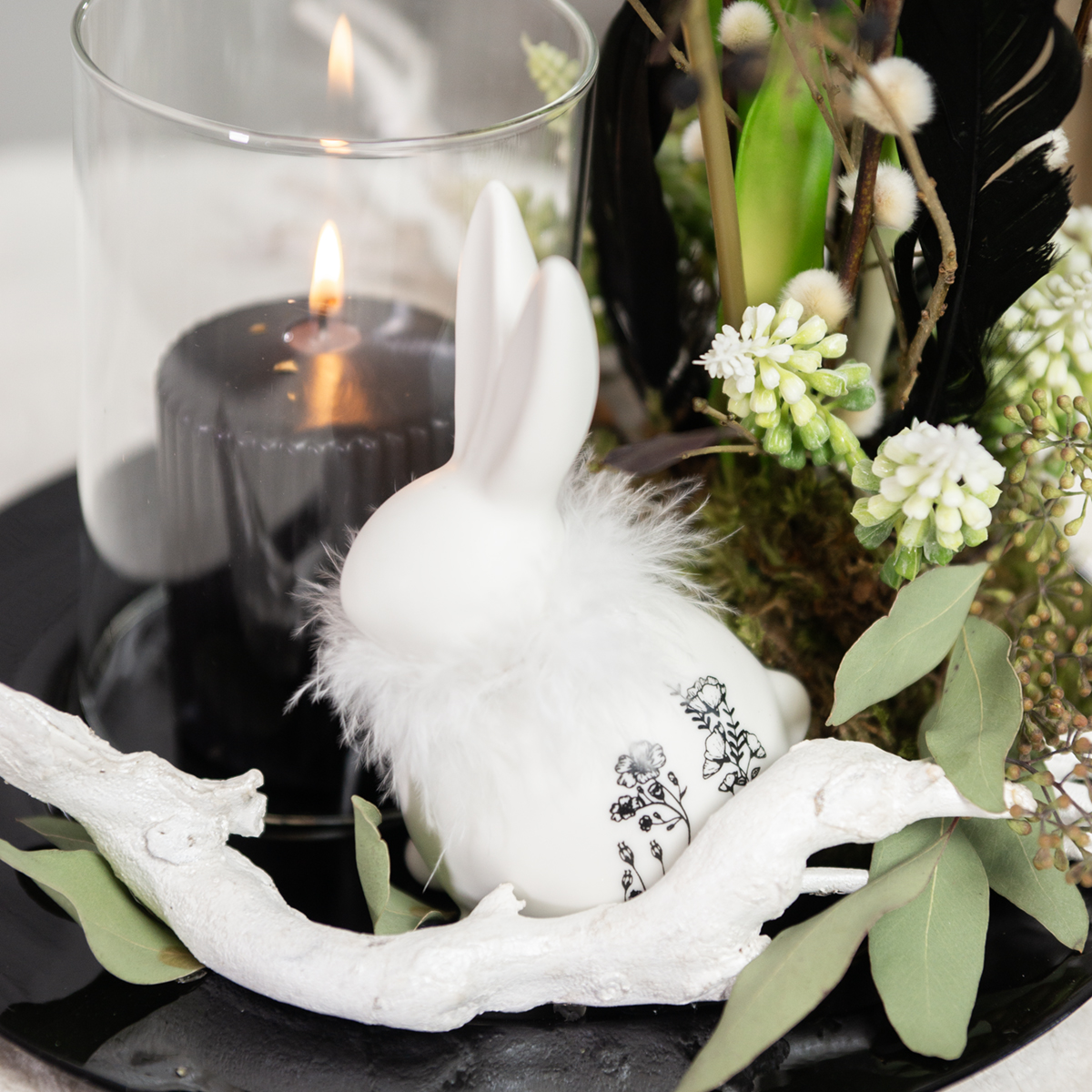 Den hvite kaninpynten stikker ørene og selv uten ansikt ser kaninene ut som om de nysgjerrig ser fremover. Kaninens runde kropp er dekorert med et svart blomstermønster på den ene siden - som et uttrekk fra en eng, egnet til våren! Den hvite, luftige fjærkragen gjør påskepynten enda vakrere.