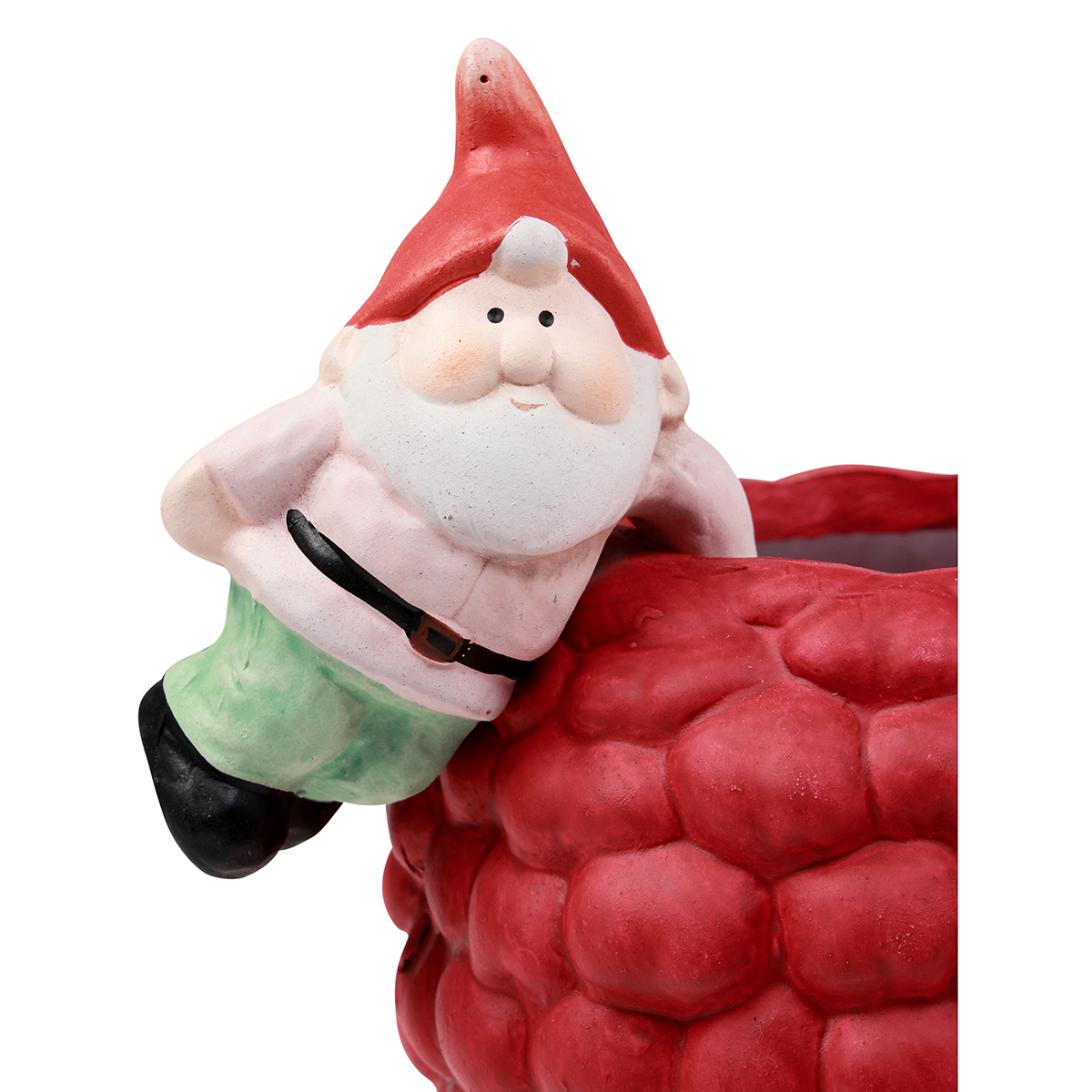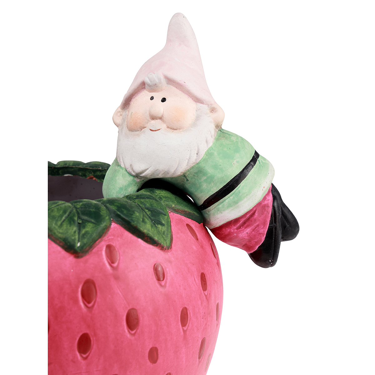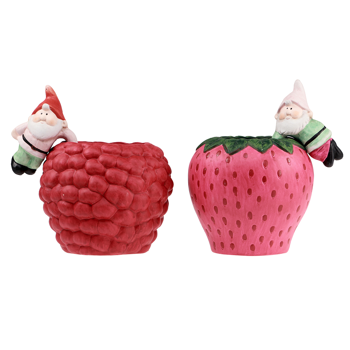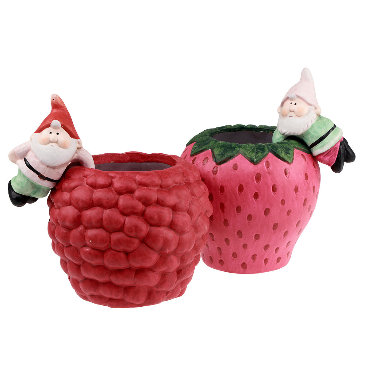 Pottene i keramikk med jordbær og bringebær er løkformede som de originale fruktene. Plantekassene blir derfor bredere i diameter fra bunnen mot åpningen. På jordbæret finner du også bunnen av de grønne bladene ved åpningen.