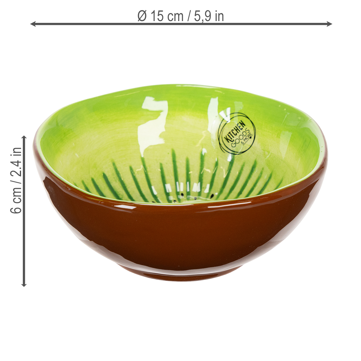 Tilfør et snev av friskhet og eleganse til borddekkingen din! Vår serveringsskål i keramikk i kiwi-design fengsler med sin harmoniske blanding av livlige grønne og jordbrune toner. Med en diameter på 15 centimeter og en høyde på 6 centimeter er denne runde keramiske skålen ikke bare praktisk, men også et blikkfang. Enten det er til stilige salatpresentasjoner, fersk fruktpresentasjoner eller fargerike snacks, vil denne designer-keramiske skålen gi bordet ditt et livlig preg. Den passer perfekt inn i moderne interiørstiler og er like allsidig for klassisk borddekking. Naturlig og slitesterk – ideell for innendørs og skjermet utendørs bruk.