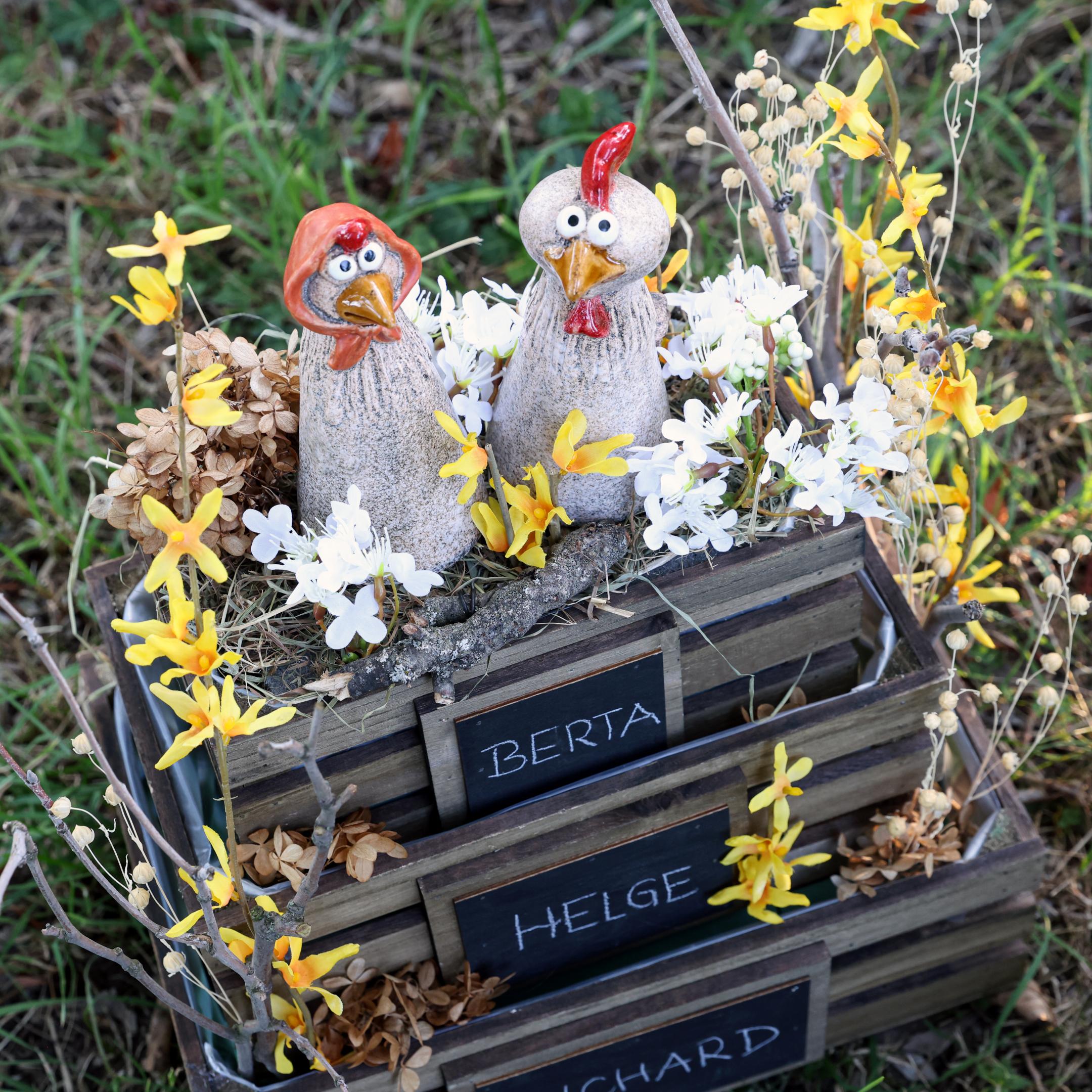 Sett et spesielt preg på hjemmet ditt med våre sjarmerende keramiske dekorative kyllinger til påske. Dette kyllingparet har en morsom hane og en morsom høne som bærer skjerf, med håndmalte detaljer i varme, jordfarger. De to figurene, hver ca 20 cm og 22 cm høye, bringer rustikk sjarm til hjemmet ditt og passer perfekt inn i en koselig landlig stil. Det nøye utførelse og humoristiske designet gjør disse keramiske figurene til et ekte blikkfang på spisebordet eller som stuedekorasjon til påsken. Bortsett fra deres dekorative appell, er hanen og høna også en utmerket gaveide for påskeferien som vil glede både familier og venner.