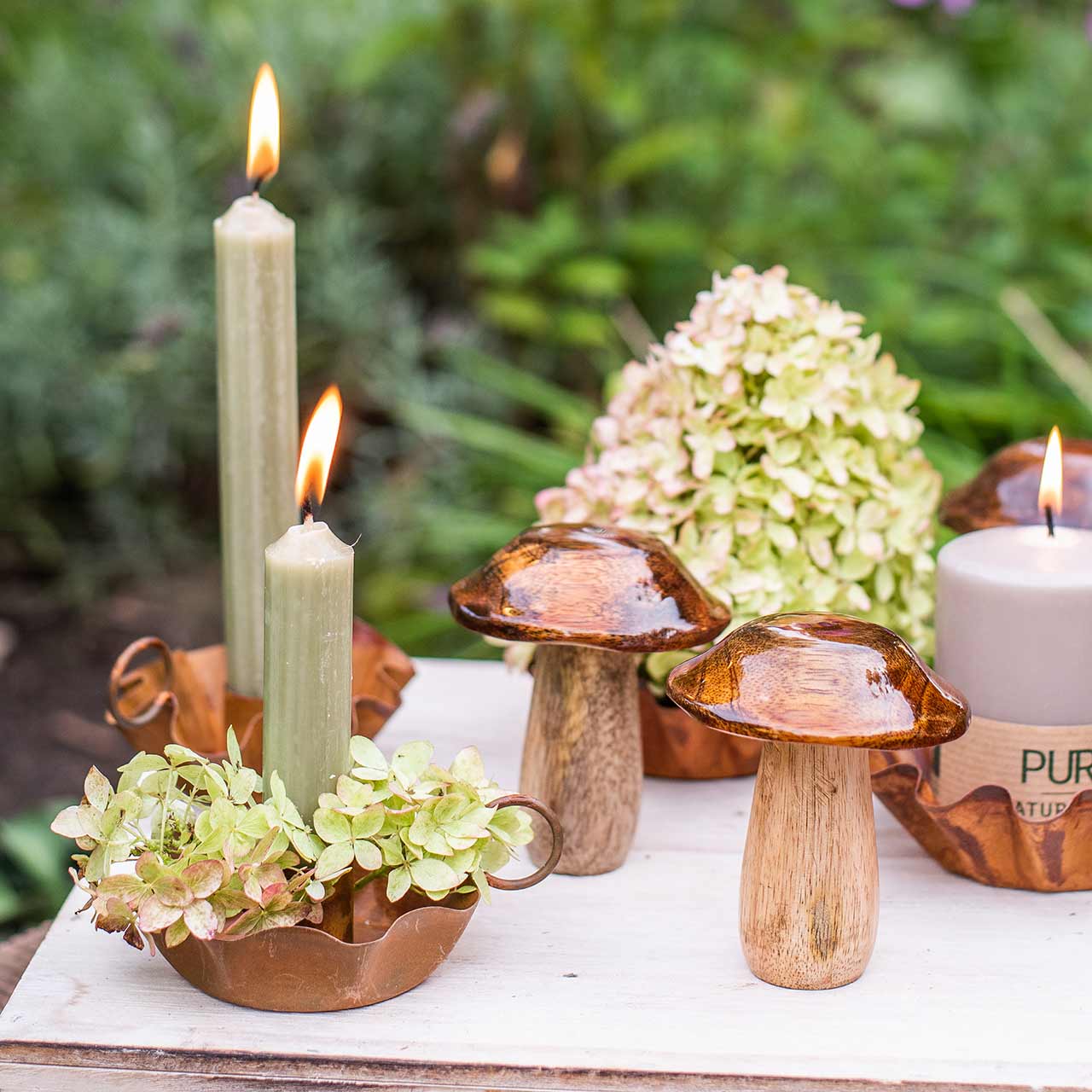 Fra tre til gull, fra rosa og rødt til gult og blått - med de små dekorative lysene i vennlig olivengrønn har du et flott tilbehør klar for et bredt spekter av farger for å harmonisere kronene dine. Hva med en skål laget av for eksempel bjørkebark om sommeren, som du pynter med urter og sølvlysestaker? De grønne koniske lysene avrunder den naturlige dekorasjonen din harmonisk!