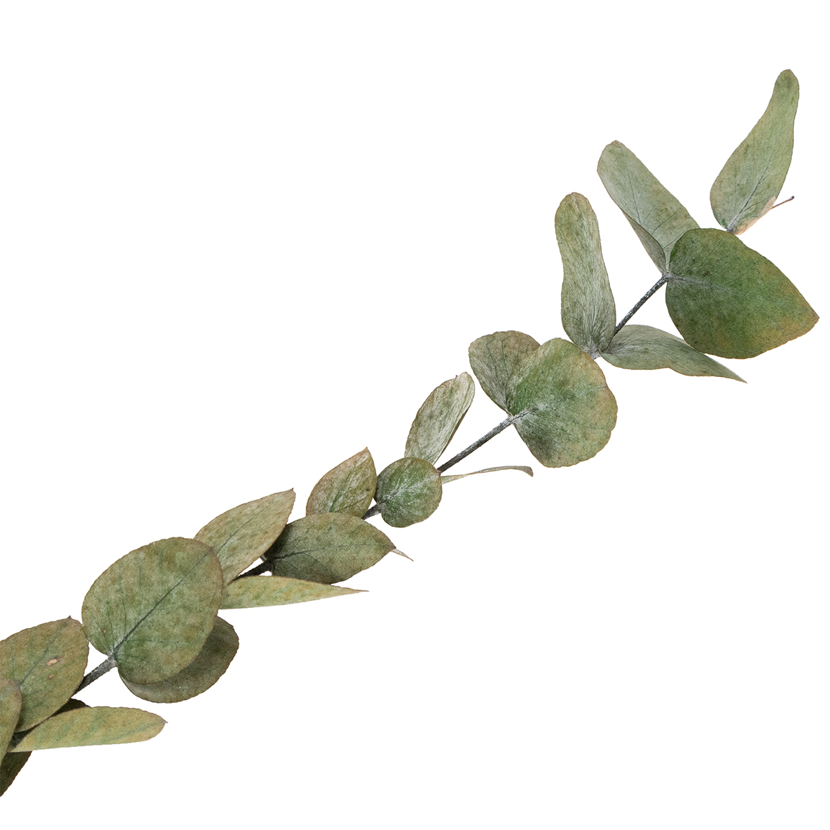 Den konserverte eukalyptusen, med sine grønne blader som klamrer seg til grenene, ser ut som om den nettopp er plukket fra treet! En skånsom prosess har bevart det naturlige utseendet til den dekorative grenen. Bladene på denne eukalyptusplanten er mørkegrønne med den typiske hvitaktige glansen – rett og slett nydelig, tidløs moderne tørkede blomsterdekorasjon!