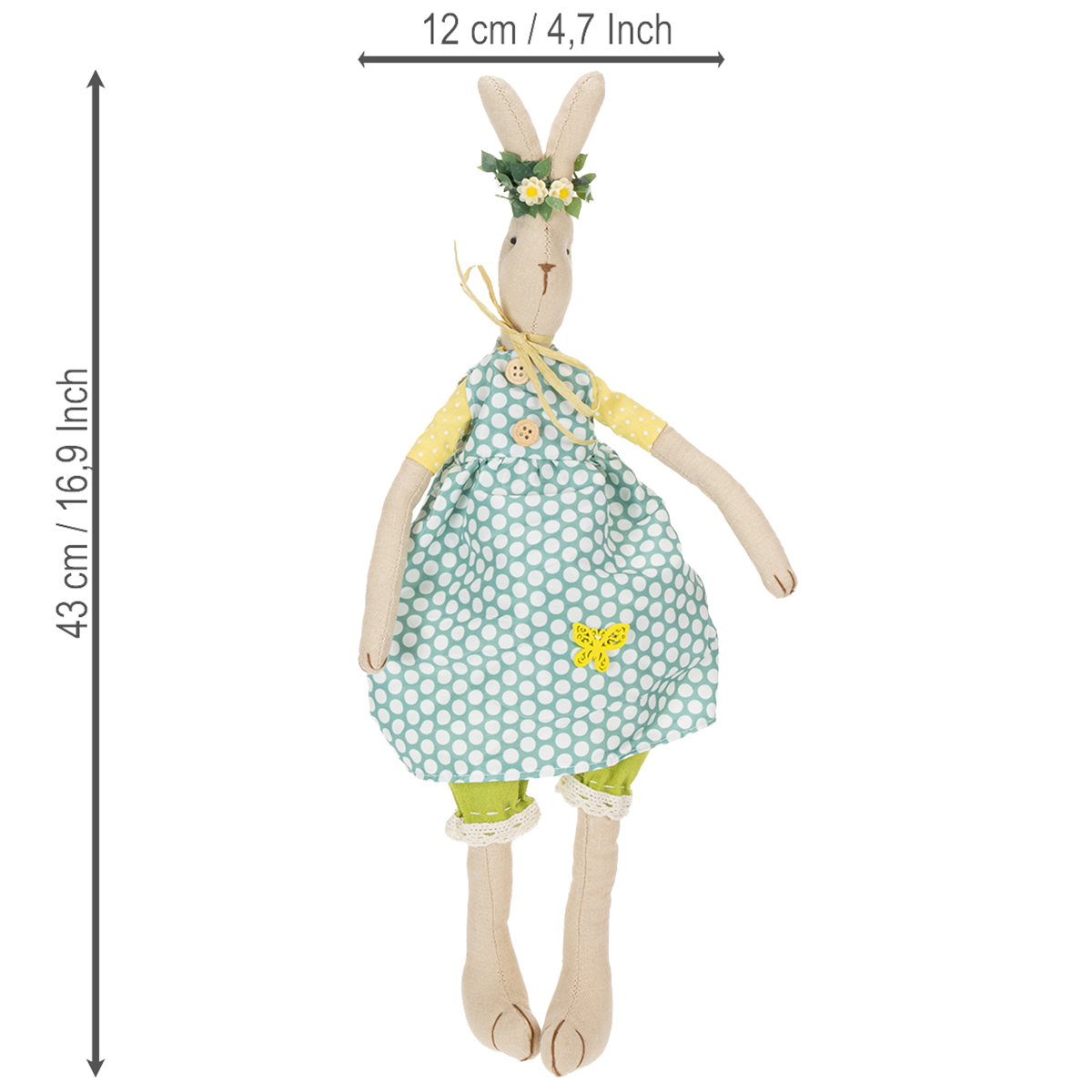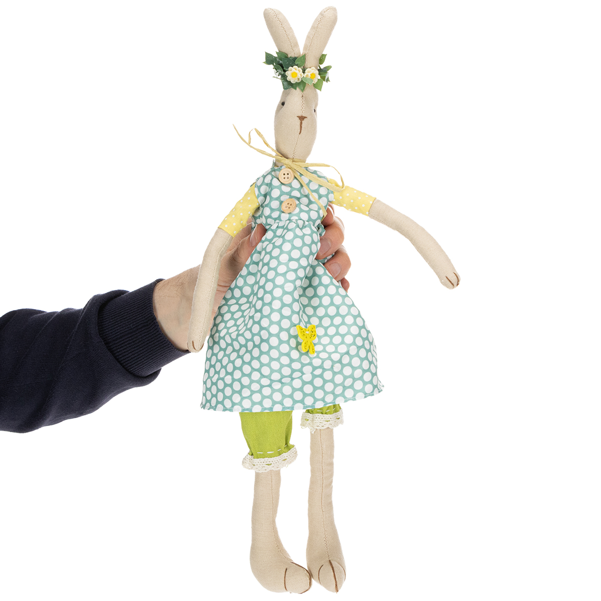 Den søte kaninjenta er laget av et enkelt naturlig stoff og har på seg en vårlignende blå kjole med store hvite prikker. Under, ermer i gult og hvitt og pene grønne haremsbukser med blondekanter fullfører antrekket til kaninen med kjole. Den vakre kaninen trollbinder også med fantastiske detaljer som treknapper og en sommerfugldekor på kappen samt en enkel sløyfe laget av papirbånd rundt halsen. Den utstoppede kaninen bærer en filigrankrans av blomster på hodet, som fullfører utseendet.
