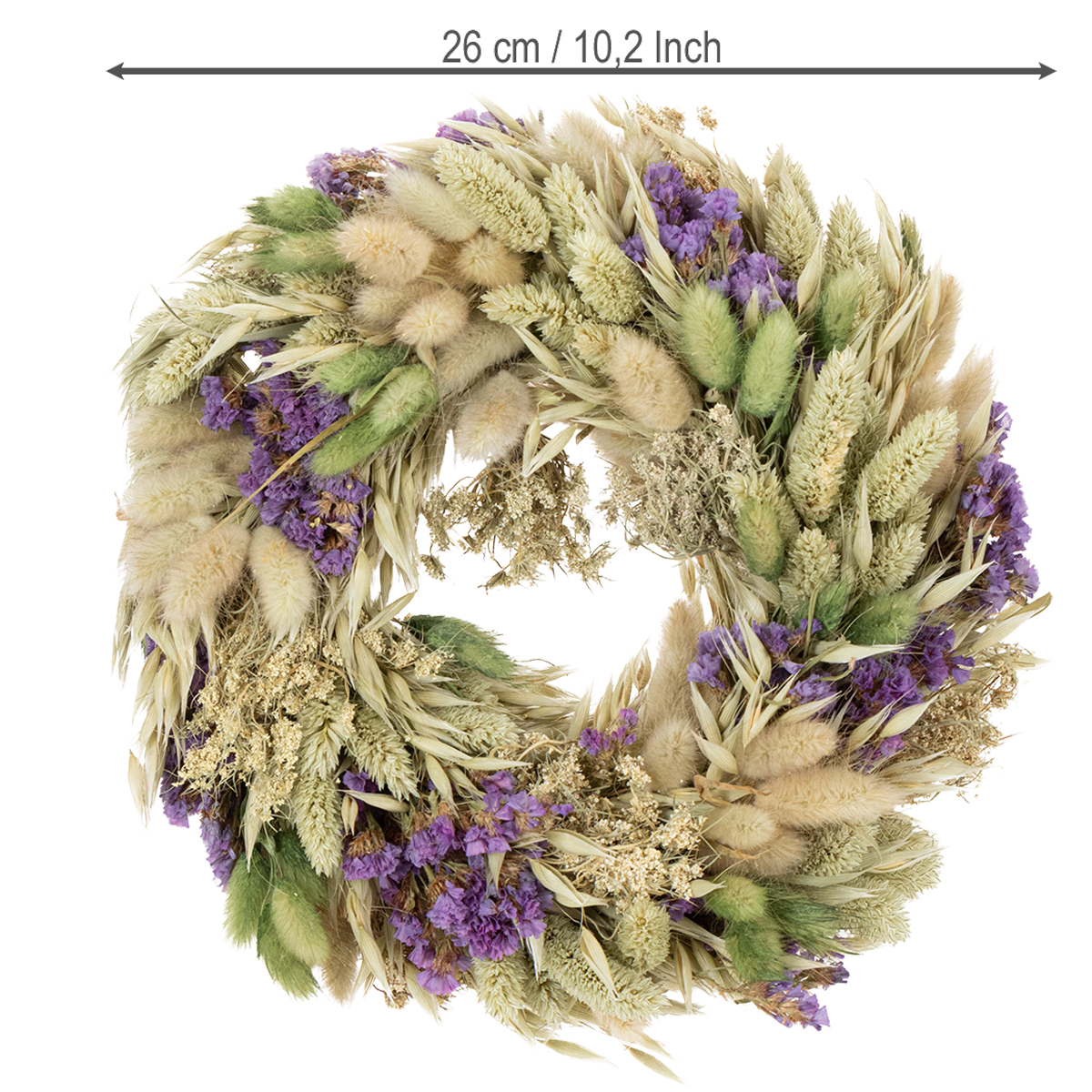 Bring vårens friske letthet rett til døren din! Vår kjærlig utformede tørkede blomsterkrans for vår og sommer, med en diameter på 26 centimeter, kombinerer naturlig eleganse med livlige fargeinnslag. Perfekt for å legge til et sesongpreg og ønske gjestene dine velkommen på døren. Med luftige gress og delikate blomster i nøye utvalgte farger som komplementerer de naturlige elementene, utstråler denne dekorative kransen eksepsjonell sjarm – et sant høydepunkt for vår og sommer. Ideell som permanent dekorasjon eller til spesielle anledninger. Laget av en rekke tørkede blomster, er denne naturlige tørkede blomsterkransen egnet for bruk både i skjermede utendørsområder og innendørs.