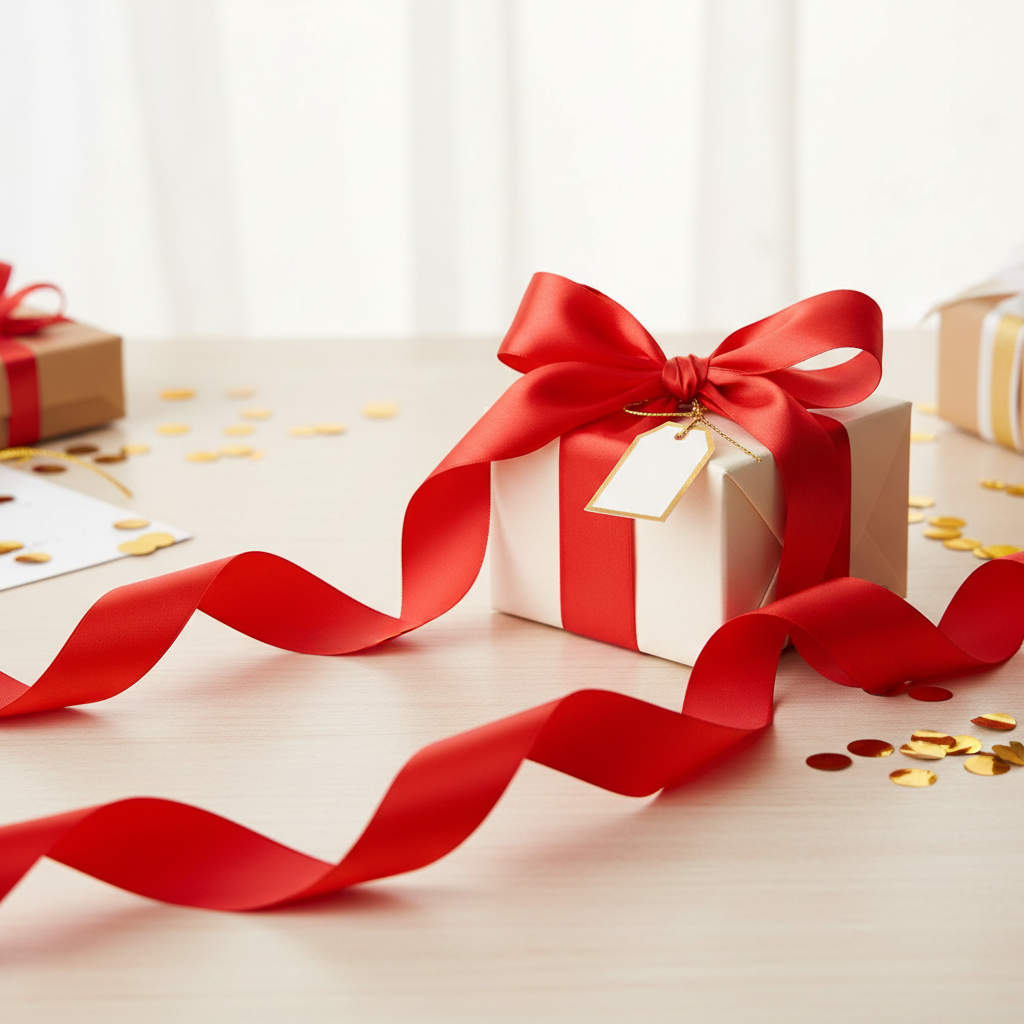 Det røde gavebåndet er viklet på en praktisk plastrulle slik at du enkelt kan måle ønsket lengde og deretter klippe den. Bruk dette dekorative båndet til å lage en romantisk dekorasjon til Valentinsdag.