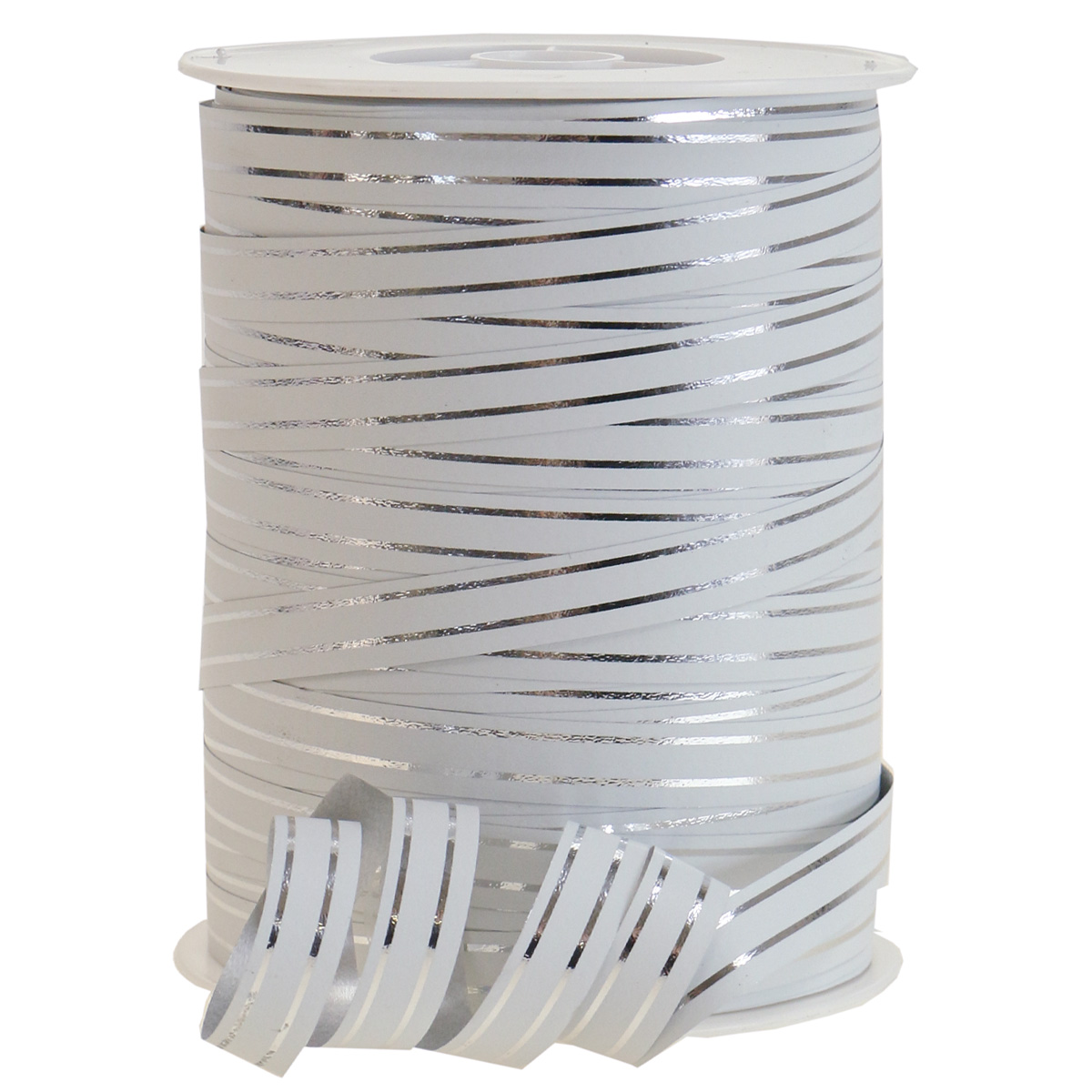 Krøllebånd gavebånd hvit med sølvstriper 10mm 250m
