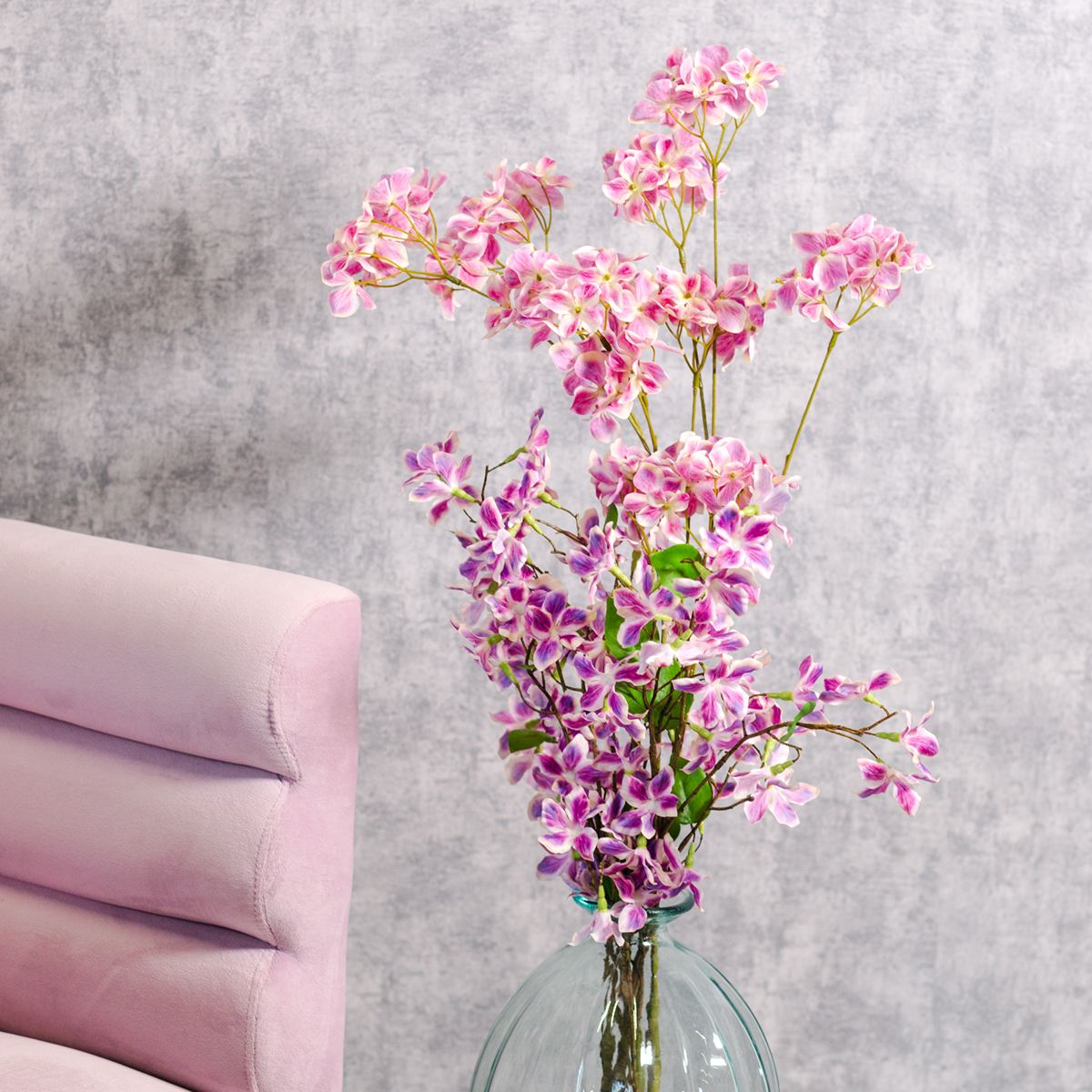 Denne kunstige hortensiaen er imponerende på alle måter – fra det tilsynelatende realistiske utseendet til den høykvalitets konstruksjonen av polyester og plast. Hver blomst ser så naturtro ut at du nesten kan lukte duften av ekte blomster. Med en lengde på 110 cm og en diameter på omtrent 40 cm, passer den elegant inn i enhver innredning uten å være påtrengende. Den varme rosa fargen harmonerer vakkert med romantiske interiørstiler som vintage eller shabby chic, men ser også fantastisk ut i moderne eller minimalistiske omgivelser. Leter du etter inspirasjon? Kombiner hortensiaen vår med hvite orkideer eller delikate eukalyptusgrener for et drømmende bordarrangement. Eller plasser grenene enkeltvis i enkle glassvaser for å gi et snev av eleganse til kommoder og vinduskarmer.