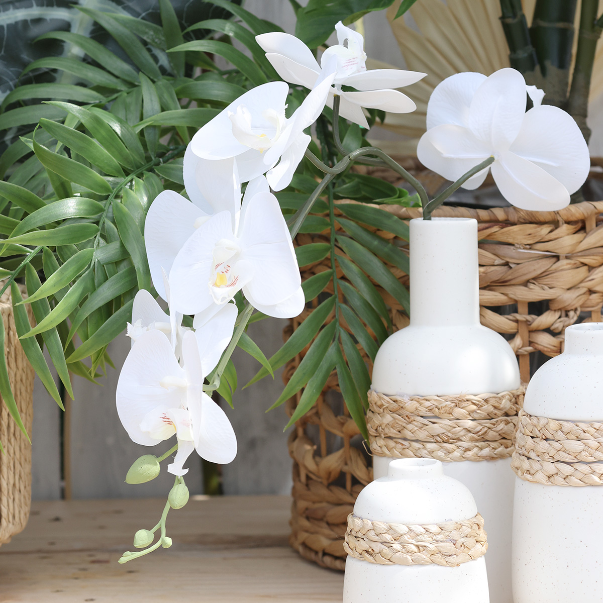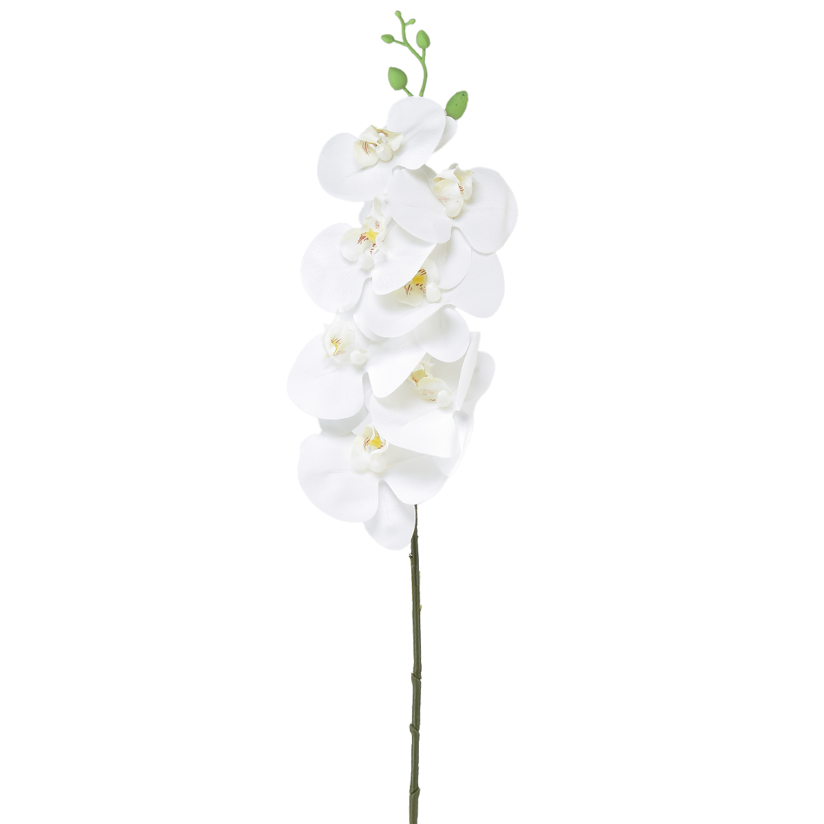 Med en lengde på litt over 80 centimeter er den hvite orkideen perfekt for en gulvvase. Den kunstige Phalaenopsis presenterer blomster og knopper.