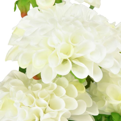 De kunstige georginene med løkformede, fyldige blomster kommer som en kunstig blomsterplukking. Den kunstige plantedekorasjonen deles øverst i to store og mellomstore hvite dahliablomster og er fylt med grønt, naturlig bladverk.