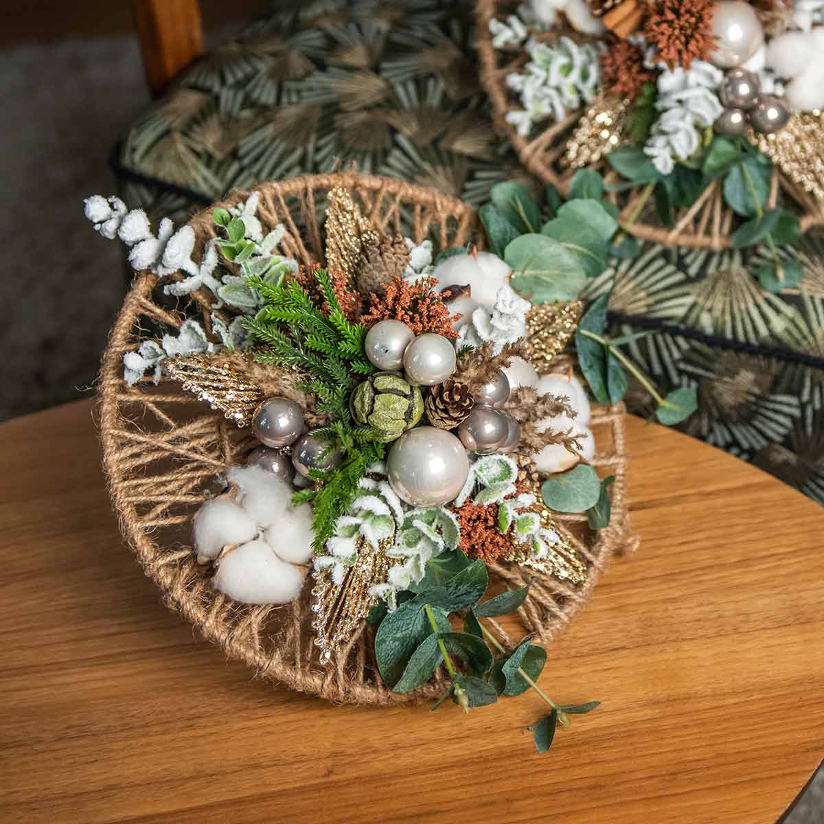 Materialer: Naturmaterialer som kongler, tre, bark, mose, kvister, blader, tørkede blomster, tang og kokosfiber.
