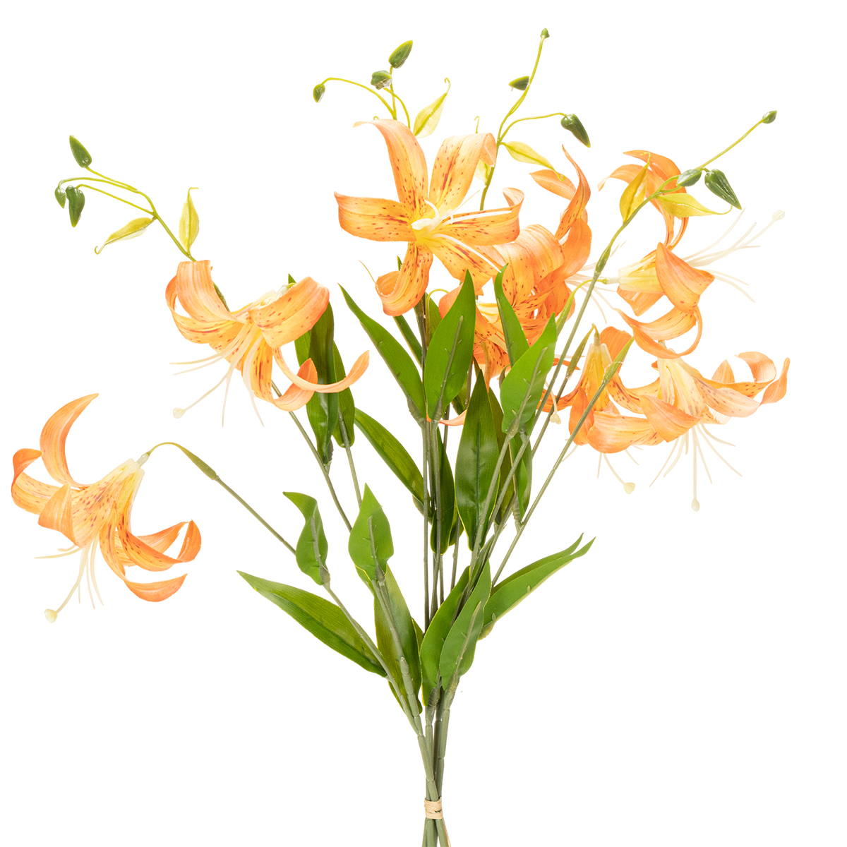 Leter du etter elegante detaljer til bryllupet eller arrangementet ditt? Våre kunstige liljer av høy kvalitet tilbyr den perfekte kombinasjonen av naturlig skjønnhet og praktisk holdbarhet. Disse kunstige liljene imponerer med sitt naturtro utseende og delikate appelsinblomster – et ekte blikkfang! Med en høyde på 77 cm kan disse kunstige blomstene enkelt integreres i fantastiske blomsteroppsatser, enten som et midtpunkt på et bord, i en stor gulvvase eller som en del av et frodig blomsterdekor. Enten det er til et bryllup, en bursdag eller et firmaarrangement, vil de forvandle ethvert rom på et øyeblikk. De er også et fantastisk valg som gaver eller borddekorasjoner. Lurer du på om de ser så ekte ut? Absolutt! Kvaliteten og oppmerksomheten på detaljer får dem til å se nesten nyplukkede ut. Prøv dem ut og gi hverdagen din et snev av eleganse!