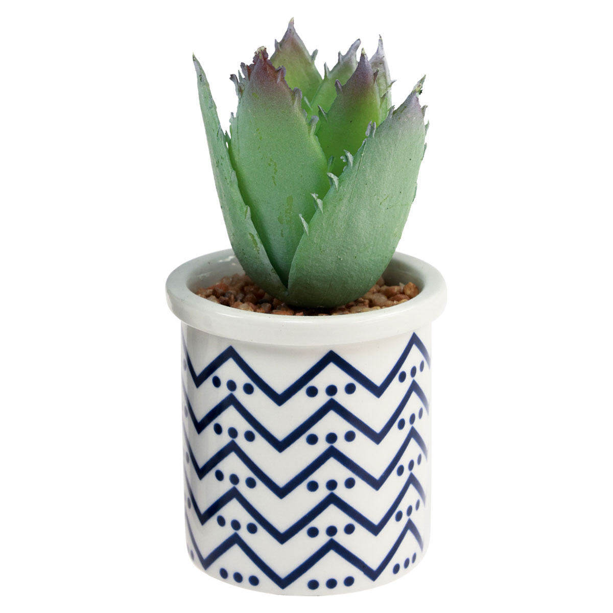 Disse kunstige plantene er sukkulenter som kunstige grønne planter av variantene Echeveria og Aloe. De kunstige plantene settes godt inn i en glasert keramikkkrukke med blått og hvitt mønster. Den kunstige jorden er dekket av pålimte brune natursteiner.