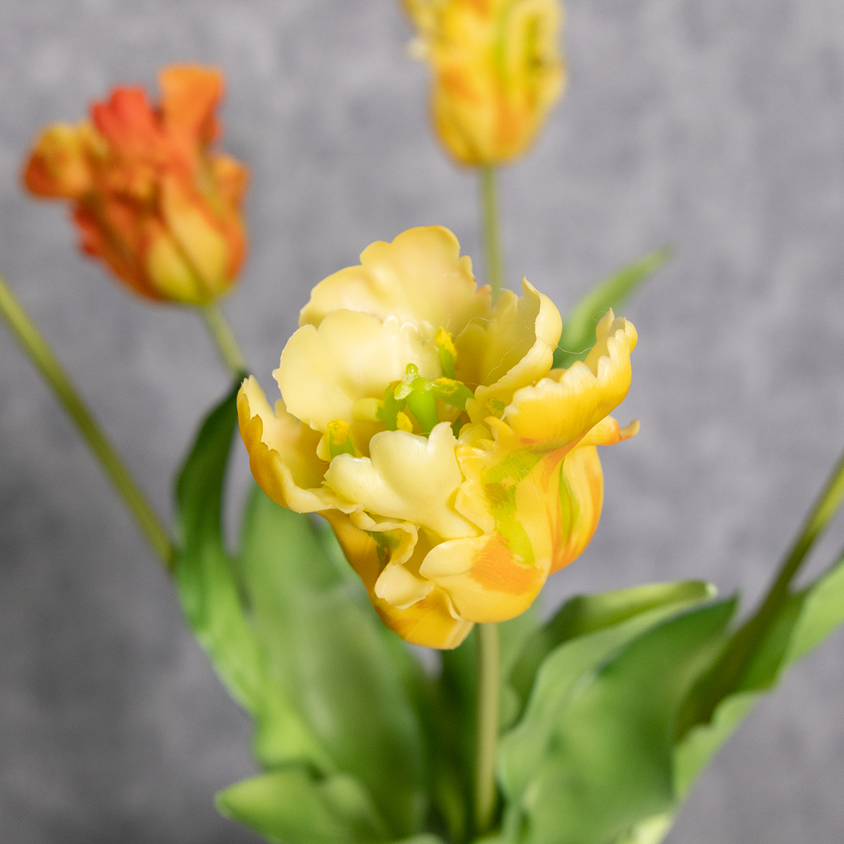 Disse kunstige tulipanene er et skikkelig blikkfang og imponerer med sitt autentiske utseende. Med en høyde på 53 cm og en diameter på 8 cm har de den perfekte størrelsen til å stille ut individuelt i en smal vase eller som en stilig bukett i en stor gulvvase. Takket være det høykvalitets polyester- og plastmaterialet føles blomstene og bladene behagelig myke og beholder sine livlige farger. En spesielt praktisk funksjon: de er utrolig allsidige. Enten som elegant stuepynt, for sesongmessige aksenter om våren eller som et høydepunkt på feiringer – den sterke fargen er en skikkelig stemningsforsterker. Kombiner enkelt tulipanene med andre kunstige blomster for å lage harmoniske buketter. For et minimalistisk utseende, arranger dem ganske enkelt i en høy hvit keramikkvase. Stilen? Tidløs og moderne! Disse tulipanene passer elegant inn i både skandinaviske, moderne og klassiske interiørstiler. Et tips til: de er praktisk talt uforgjengelige – perfekte for husholdninger med barn eller kjæledyr. De som ofte bytter dekorasjoner, vil elske fleksibiliteten deres: bare bytt vase, prøv et nytt arrangement – og et nytt dekorasjonskonsept er skapt.