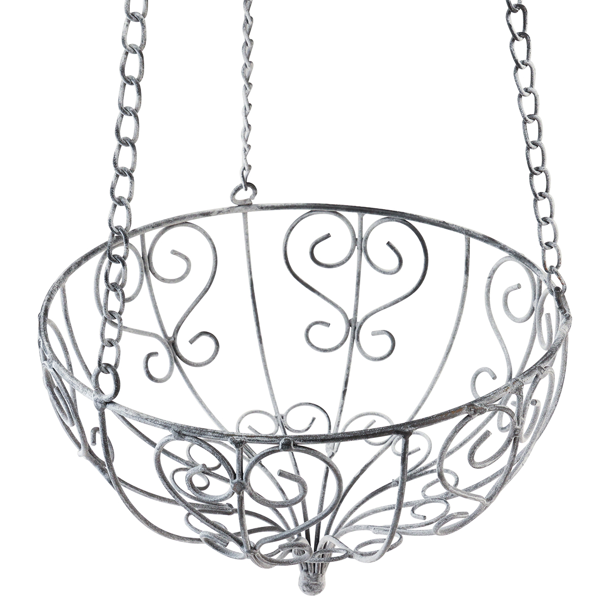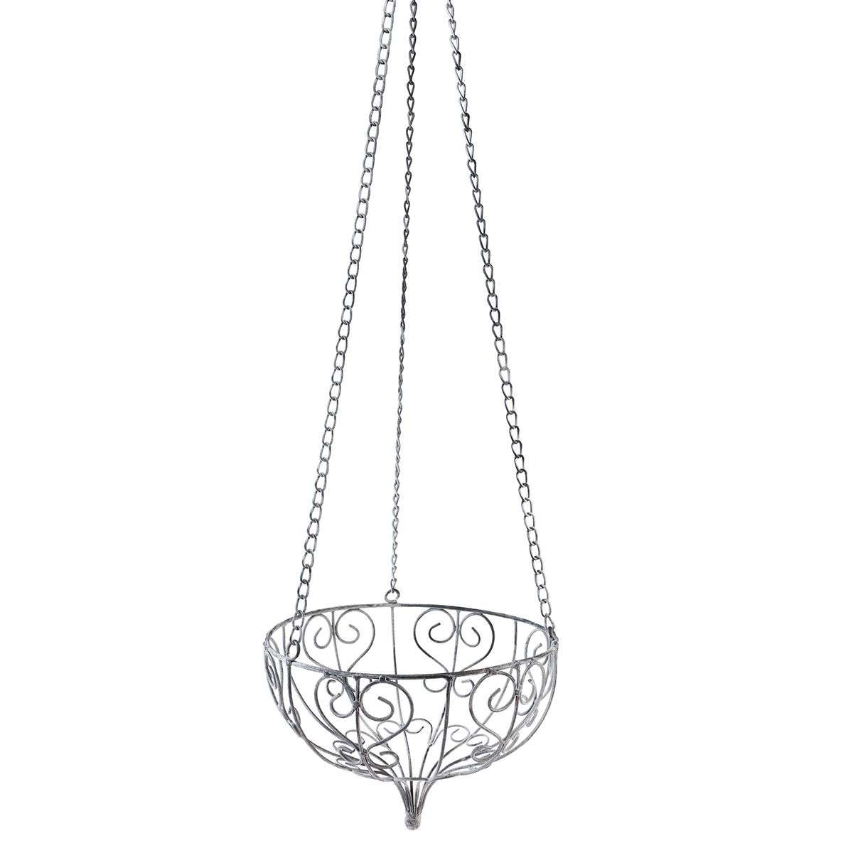 Utsmykkede hjerter dekorerer sidene på denne metallkurven. Vasket hvit som den er, utstråler den sølvgrå metalldekorasjonen ekte vintage-teft.Metallkurven har form som en bolle som kommer sammen i bunnen for å danne en rund spiss som en antikk dekorasjon. Metallkurven er stabilisert på tre kjeder. Øverst binder en krok sammen kjedene, som du deretter kan bruke til å henge metallkurven fra taket.