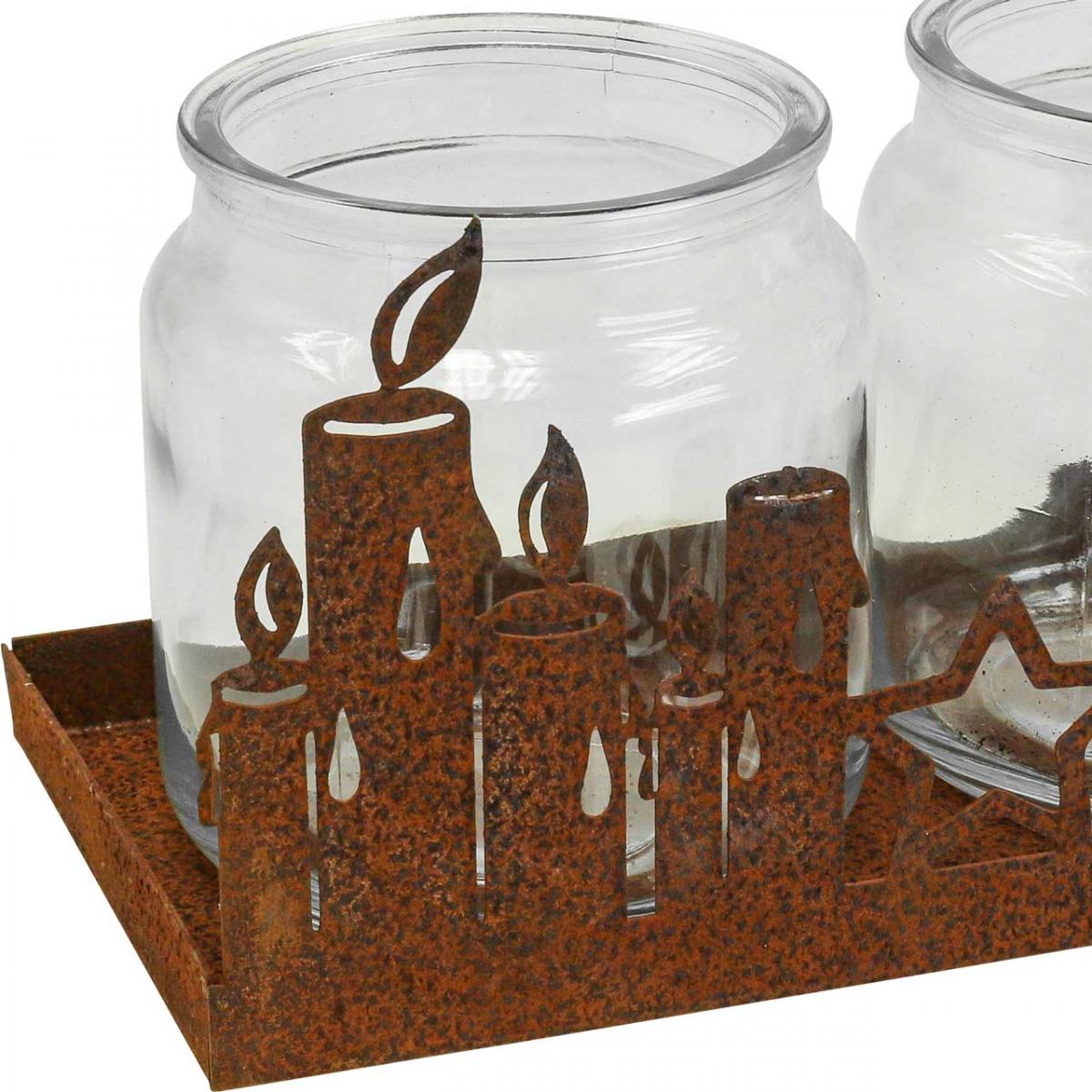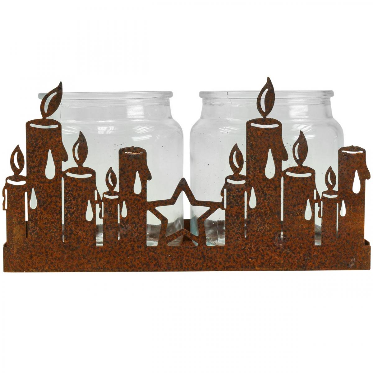 Metallbrettet som de to lyktglassene står på har tre lave kanter og en høy, dekorativ silhuett av et stearinlys foran.