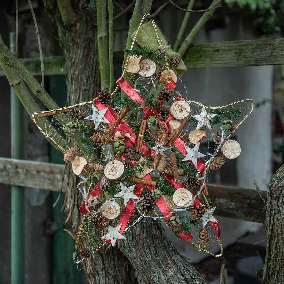 Lyskjeden er også forbundet med en jutesnor. På den er det festet treskiver som ser ut som miniatyrtreskiver og har et snøfnuggmotiv på seg. Den innvendige lyslenken gir ikke bare lys, men er også en krans med dekorative trependler.