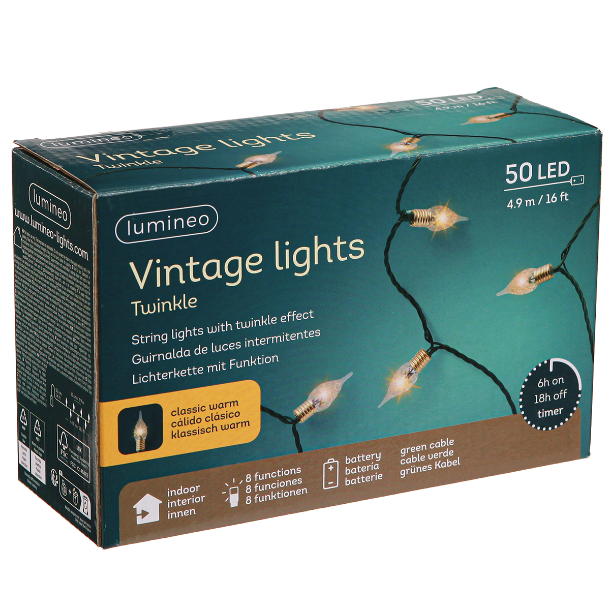 Den integrerte timeren (6t på/18t av) gjør betjeningen enklere og sikrer automatisk og bærekraftig belysning. Takket være den trådløse og batteridrevne funksjonen er den enkel å installere hvor som helst uten å stole på strømuttak. Den gylne kontakten og den grønne kabelen med matchende grønt batterirom gir eventyrlysene en nostalgisk retrosjarm. Opplev en rekke lysvariasjoner med de 8 forskjellige funksjonene som Flash (blinker som glitrende snø), Fade (langsom dimming) eller Twinkle (flammeeffekt), som du enkelt kan kontrollere på batterirommet.
