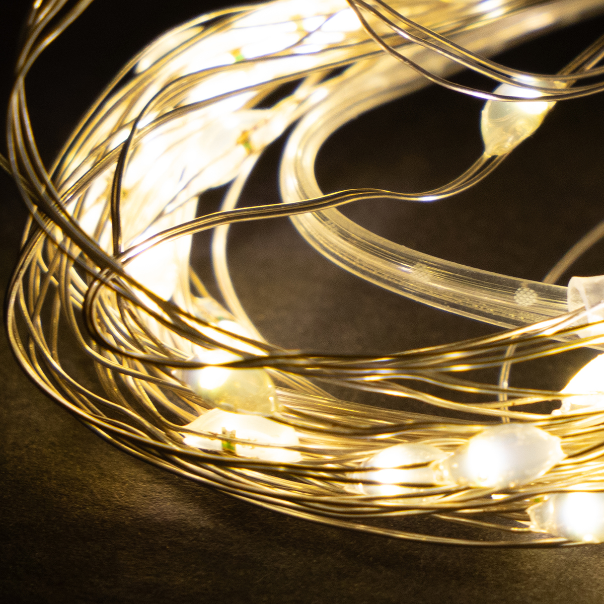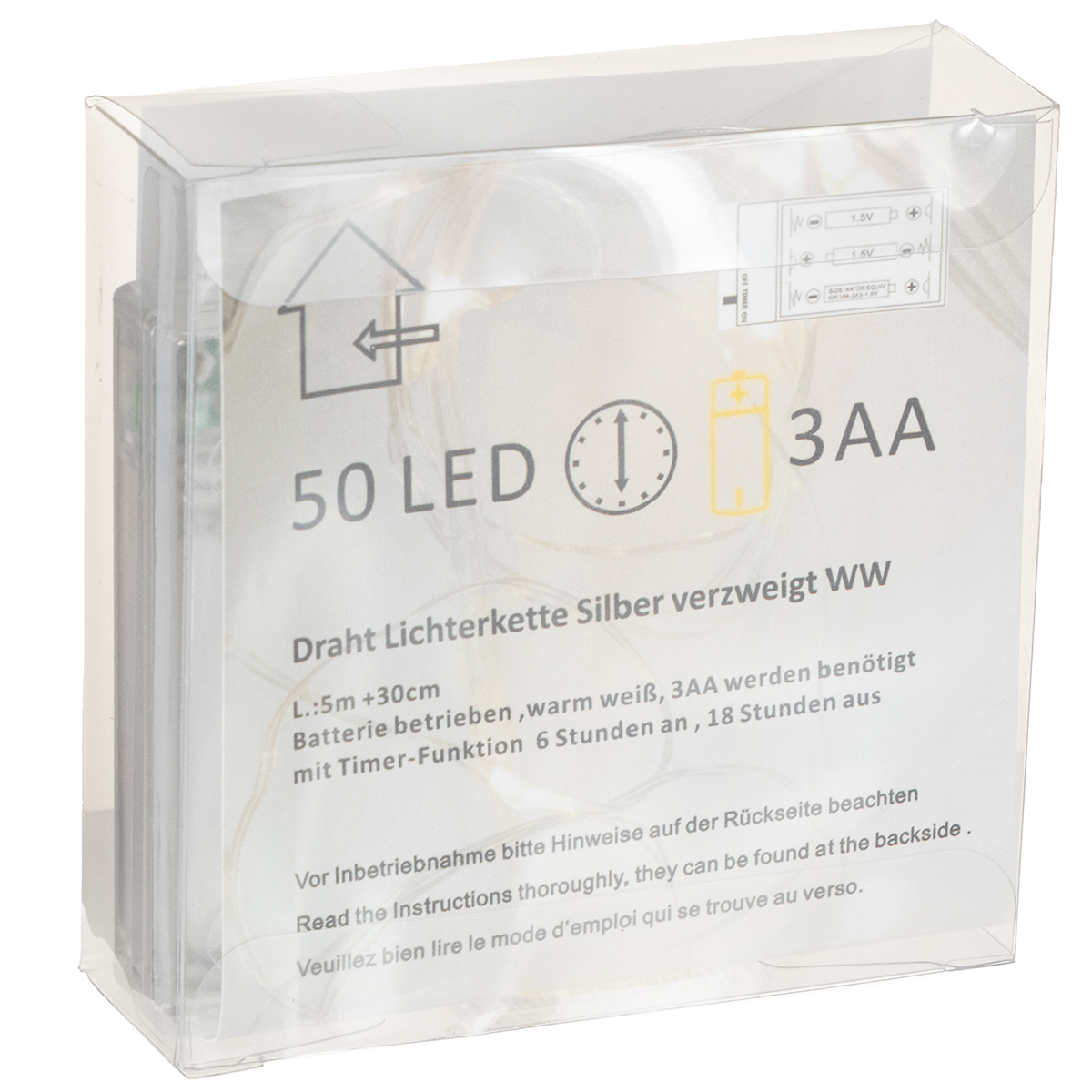 Denne 5 meter lange LED-lyslenken, drevet av batterier og avgir et varmt hvitt lys, krever bare 3 AA-batterier for å lyse opp de 50 individuelle LED-lysene, som er plassert 10 centimeter fra hverandre. Ledningen fra batteriene til den første LED-lyslenken er 30 centimeter lang.