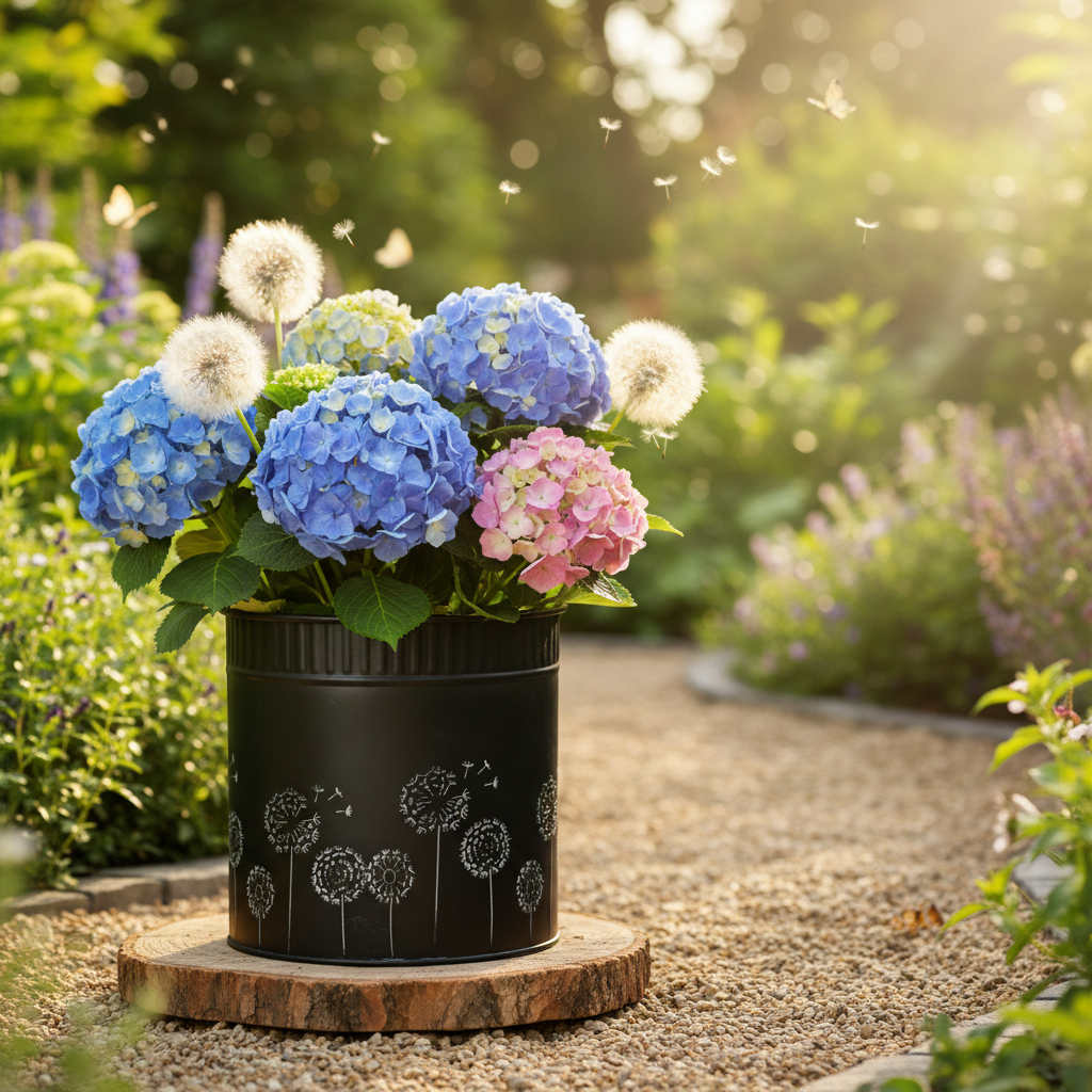 Plantekassen med løvetann gir blomster og arrangementer et originalt utseende i sommerdekorasjoner. Men den svarte blomsterpotten kan også gi en spesiell ramme for en liten grønn plante.