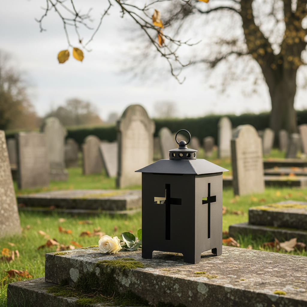- Robust antikk gravlyslykt laget av grått metall for en andaktsfull atmosfære