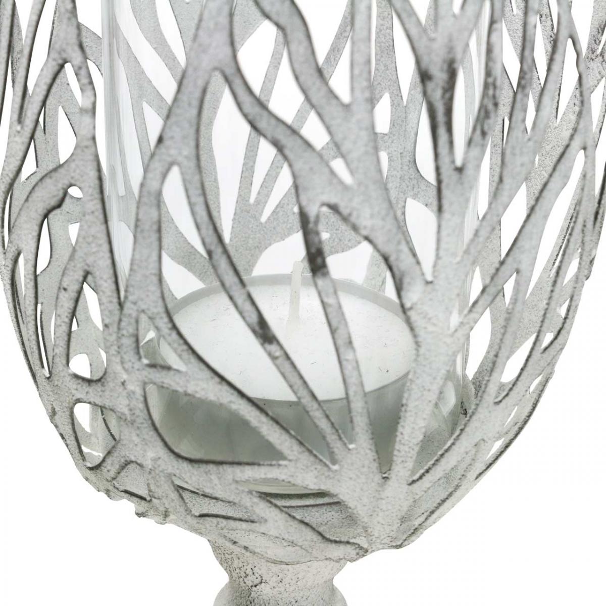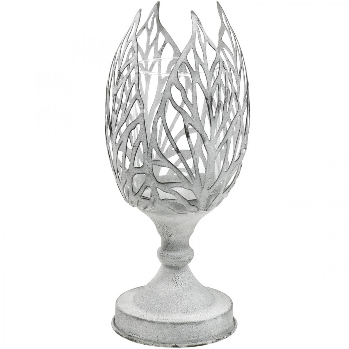 Denne attraktive metalldekorasjonen er formet som en åpningsblomst. Vasket hvit, i en trendy shabby chic stil, passer lykten på alle festlige bord, på balkongen eller på terrassen. Lykten er utstyrt med et bunnløst glass som du enkelt kan ta av for rengjøring og sette inn igjen før bruk.Telys og stearinlys med en diameter på ca. 7 centimeter kan plasseres i glasset. Lyset holdes i kalken av en stikkontakt. Glassylinderen fungerer derfor som et klassisk vindfang. Det formfulle begeret bæres i form av en blomst på en like stilig base.