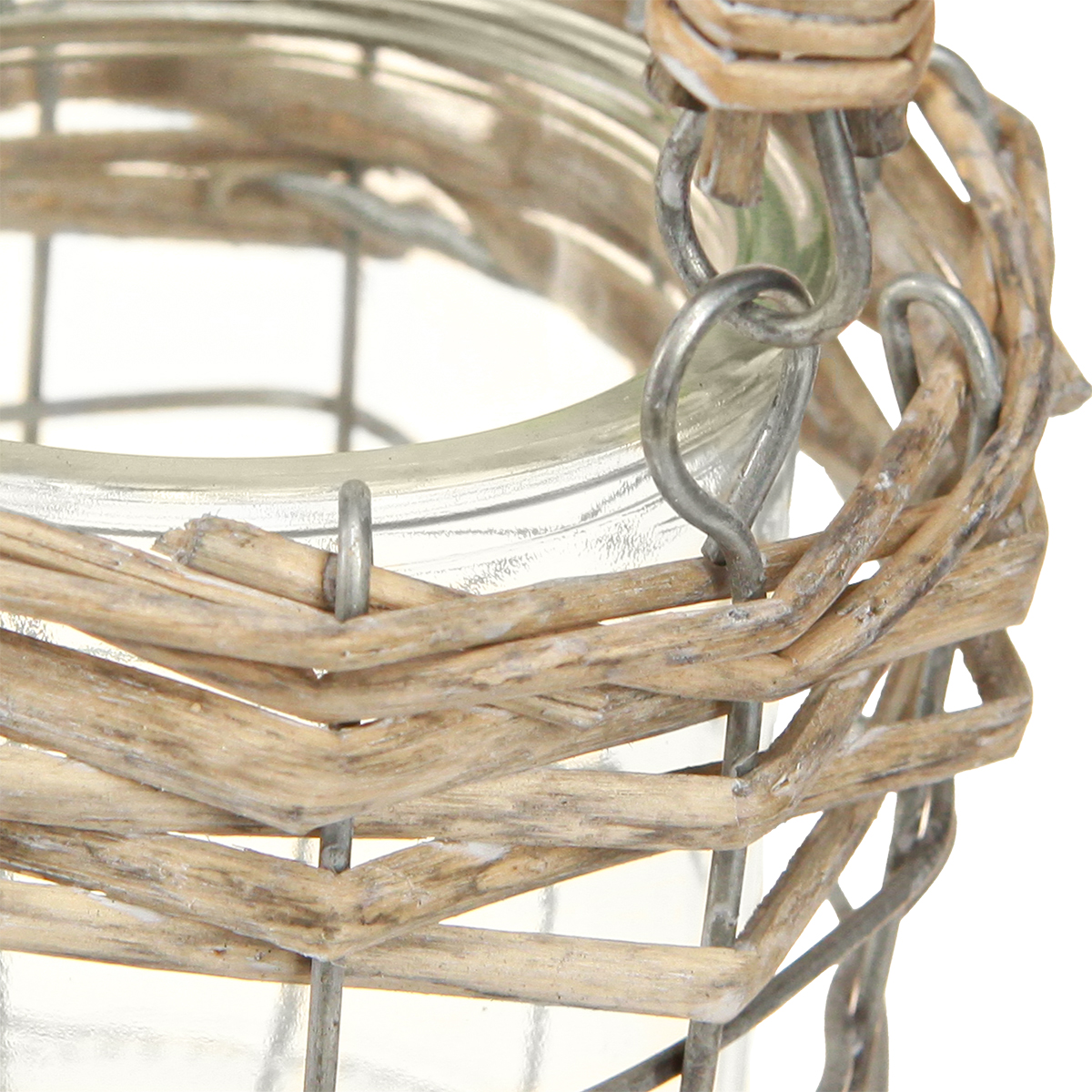 Opplev den harmoniske kombinasjonen av glass, metall og selje med våre rustikke telysholdere. Den rustikke designen med en diameter på ca. 10,5 cm er perfekt for en rekke dekorasjonsideer. Telysholderen består av et solid metallgitter, som er kunstferdig dekket med gråvaskede pilegrener. Det lange, bevegelige pilehåndtaket gjør at du kan plassere lyktene fleksibelt - enten som hengende dekorasjon på balkongen din eller som et stilig borddekorasjonselement innendørs. Det robuste, avtakbare lyktglasset gir plass til telys, smale, korte søylelys eller LED-stolper og gir dermed behagelig belysning. Legg til et snev av vintage sjarm til omgivelsene dine og skap en innbydende atmosfære som er perfekt både vår og sommer.