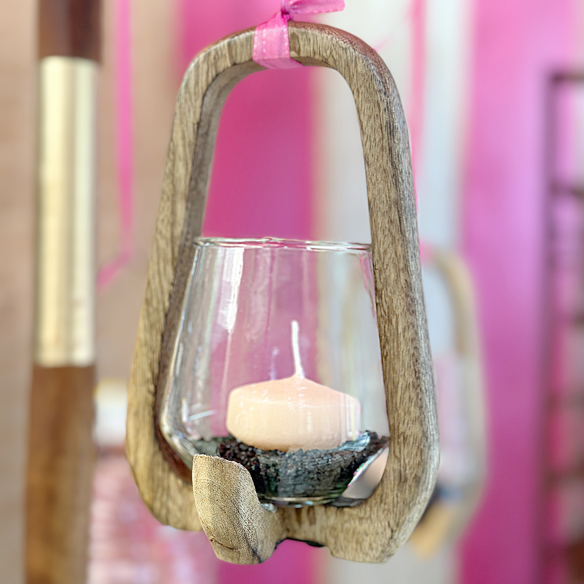 Enten som sommerdekorasjon på balkongen eller som koselig belysning under en feiring, skinner denne glasslykten både på dagtid og kveldstid. Hver del er unik fordi den er laget av naturlig mangotre, som også representerer et bærekraftig og miljøvennlig aspekt.