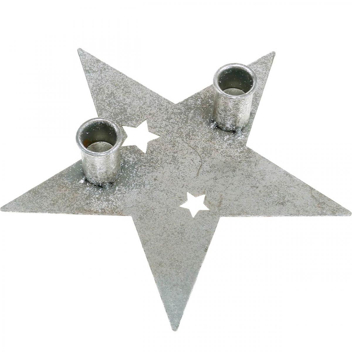 Lysdekorasjonsstjerne, metalldekor, lysestake for 2 koniske lys sølv, antikk utseende 23cm × 22cm