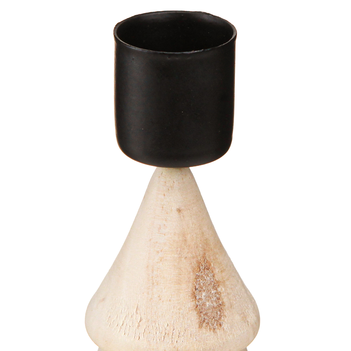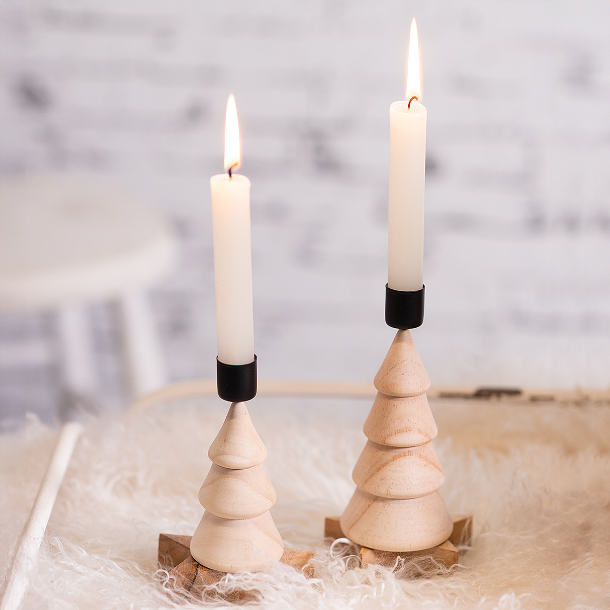 Den juletreformede lysestaken laget av naturlig tre bringer et stykke natur rett inn i hjemmet ditt. Disse dekorative lysestakene er ideelle for å skape en stemningsfull atmosfære i julesesongen. Med en høyde på omtrent 13 cm er de perfekte for festlig borddekorasjon eller som et koselig høydepunkt på peishyllen. Designet kombinerer minimalistisk eleganse med rustikk sjarm, takket være det umalte, FSC-sertifiserte treverket. En spesiell aksent gis av den svarte metalllysestaken på toppen av treet, som gir et moderne preg. Disse lysestakene i klassisk skandinavisk stil passer perfekt til all julepynt og er en flott gaveidé til dine kjære. La harmonien mellom tre og metall bidra til en varm og innbydende atmosfære og nyt den kontemplative tiden med familie og venner.