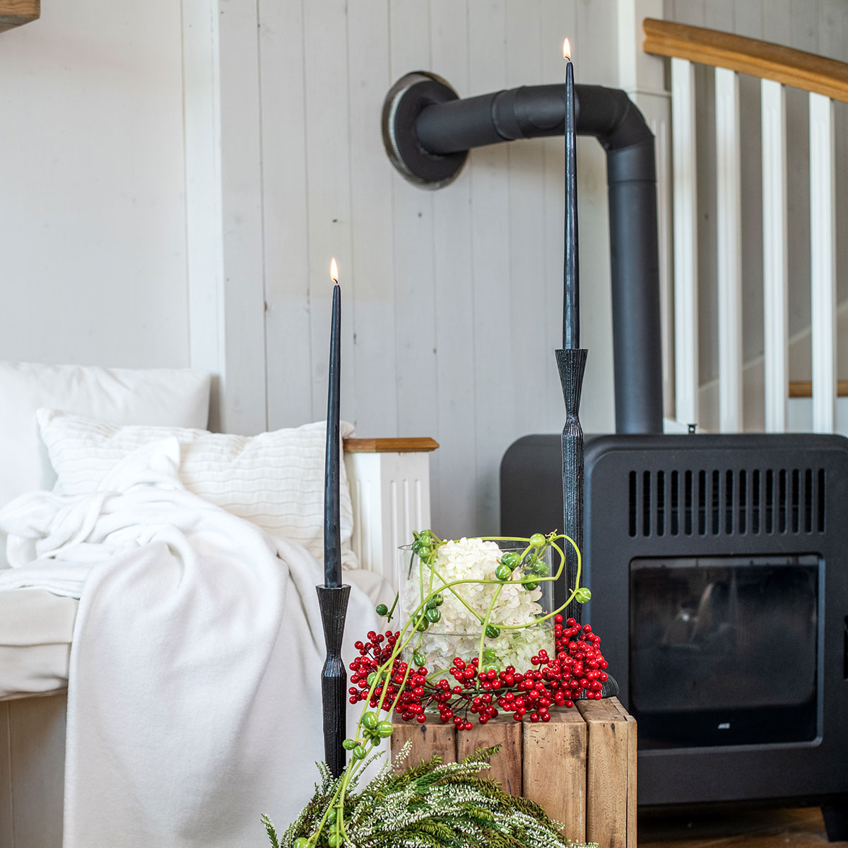 To lysestaker og svarte lykter med silhuetter av grener eller denne lysestaken med sin mindre motstykke utvider også stearinlys og dekorasjoner imponerende innendørs.