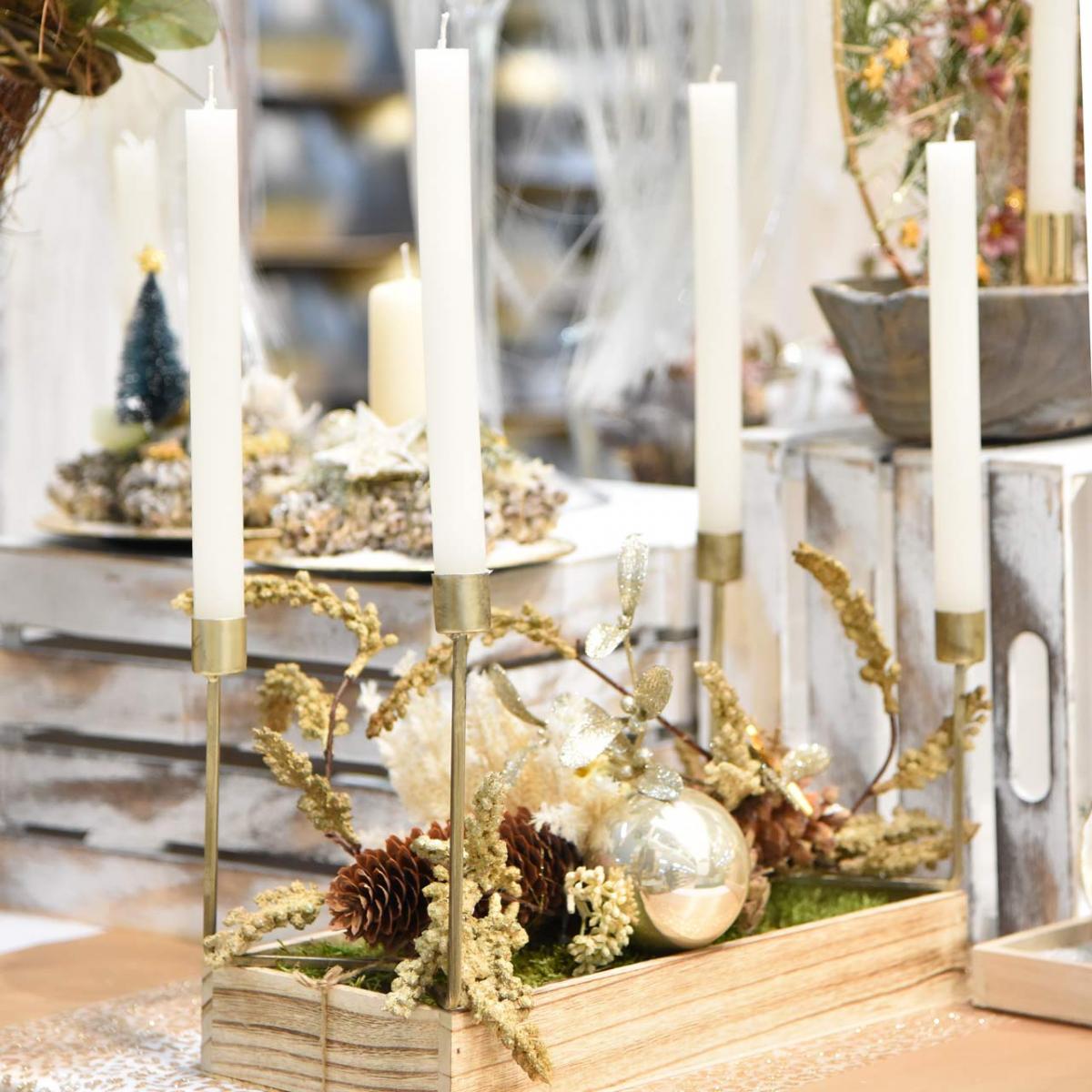 Advent lysestaken i en lys, matt gullton kan enkelt plasseres på et rektangulært brett. Plasser et blomsterarrangement, mose, dekorativ sand eller kjegler og nøtter på lysestakenes struktur. De enkelte lysestakene ser ut til å vokse ut av dekorasjonen din. Vær oppmerksom på at basen skal være ufølsom og ikke brennbar, den varme voksen kan dryppe ned. Hvis du vil være på den sikre siden, kan du sette LED ekte vokslys på lysestaken til stearinlysbrettet.