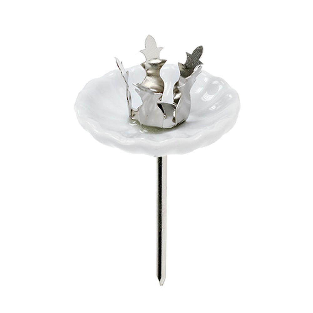 Lysestaken til trelys i sølv og hvitt kommer i et sett med 4 og har en total høyde på ca. 7 cm. Kronene har hver en diameter på ca 4 cm og er ca 2 cm høye. Kronespissene er svakt buet utover og elegant serrated.