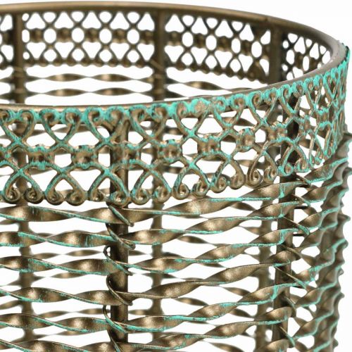 Metallstripene er vridd inn i hverandre og kunstferdig utformet for å danne den sylindriske formen til lysestaken. Den øvre metallkanten består av spesielt utsmykkede ornamenter. Grunnfargen på lysestaken er en edel gyldenbrun som er dekket med lyse turkise penselstrøk og dermed skaper en kunstig kobberpatina.