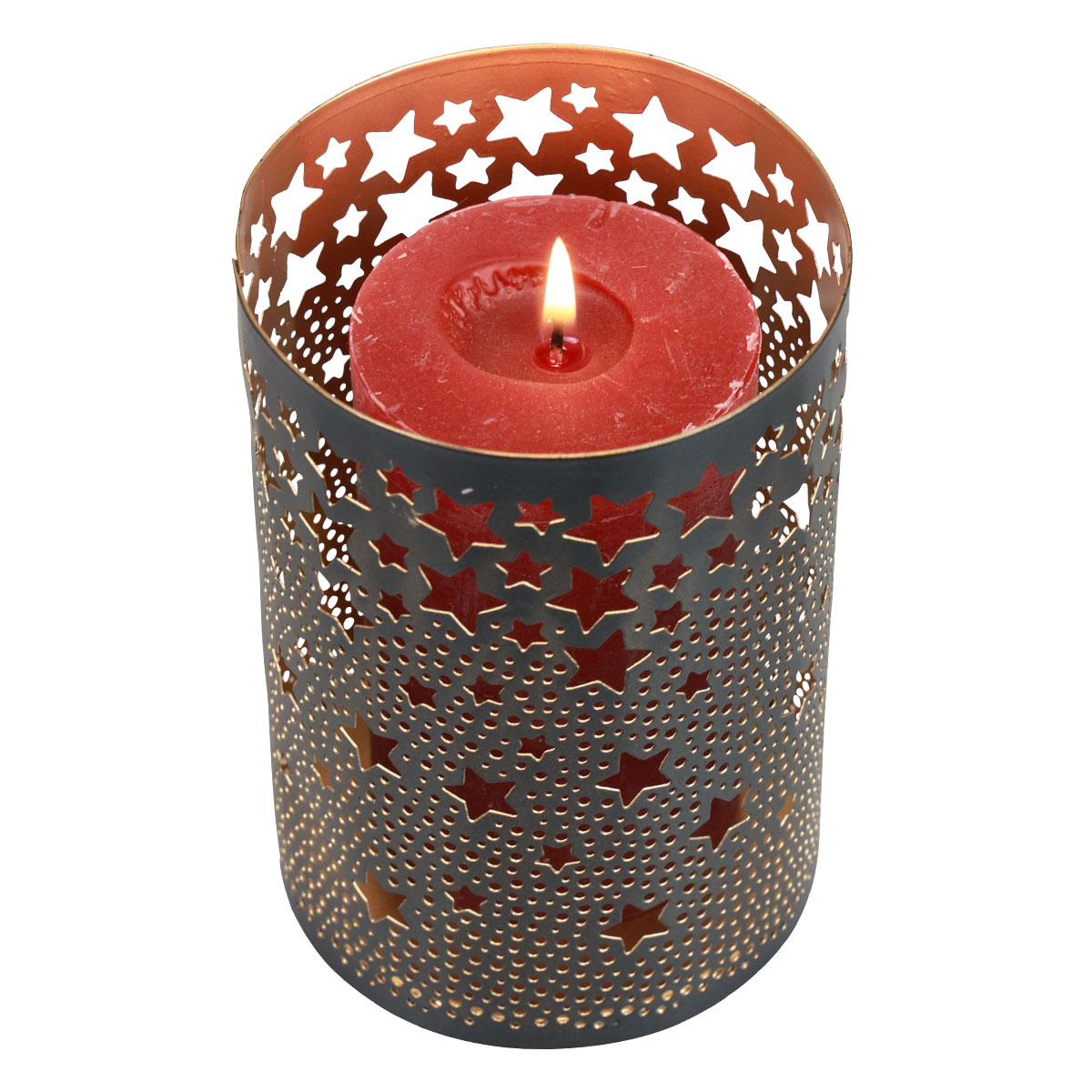 Sett et telys inni for å la stearinlyset skinne gjennom de mange stjernene. Eller utstyr lysestaken med et søylelys, hvis farge skimrer gjennom de kunstneriske perforeringene. Stearinlys i sort, rødt eller gull er spesielt effektive.