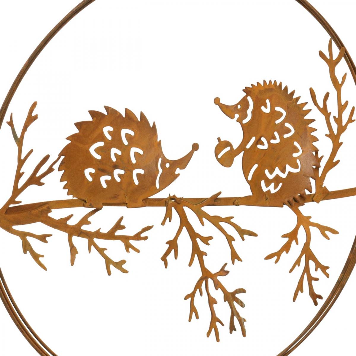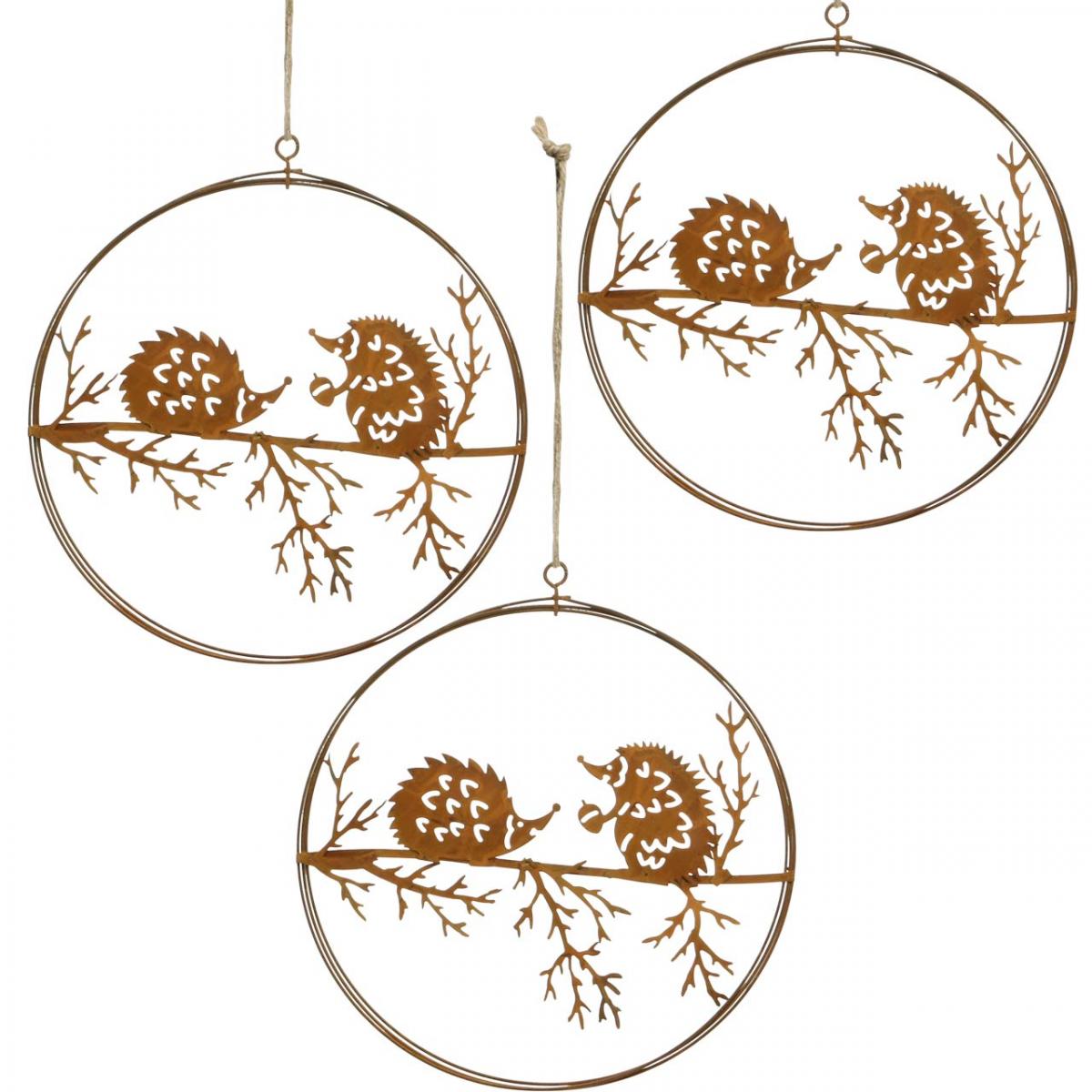 Metallanheng, pinnsvin på gren, høstdekor, dekorativ ring patina Ø15,5cm 3 stk.