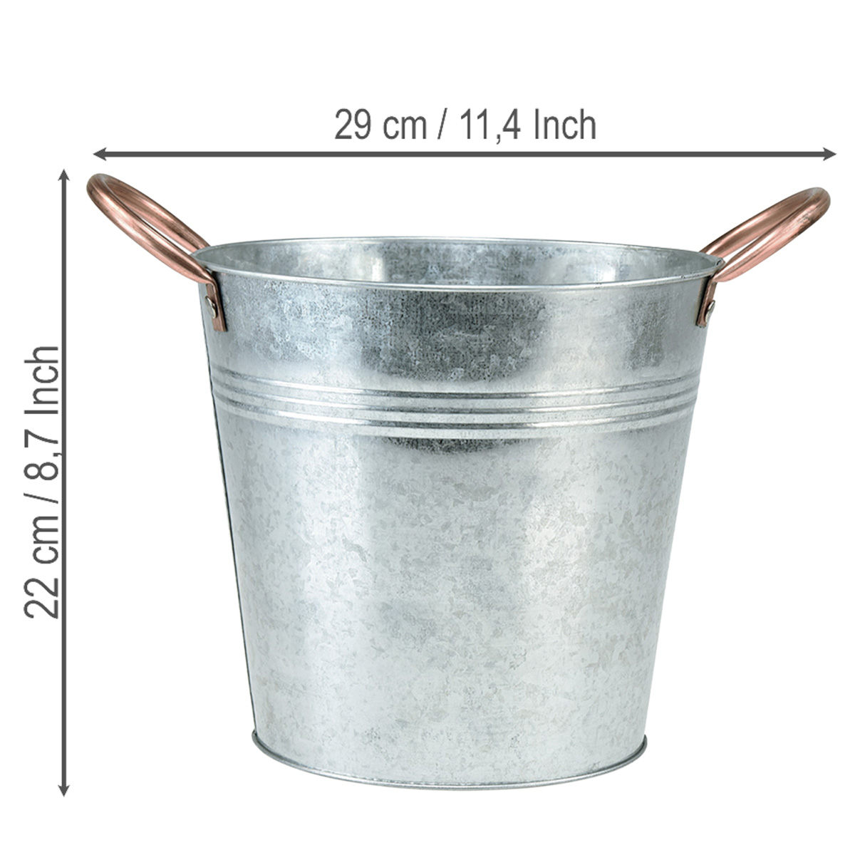 En fengslende kontrast av forskjellige metaller skapes av de kobberfargede håndtakene på denne metallbøtten. Den galvaniserte, skinnende sølvoverflaten gir plantekassen et subtilt vintage-utseende. Før planting er det lurt å fore metallbeholderen med folie for å forhindre rust og korrosjon.