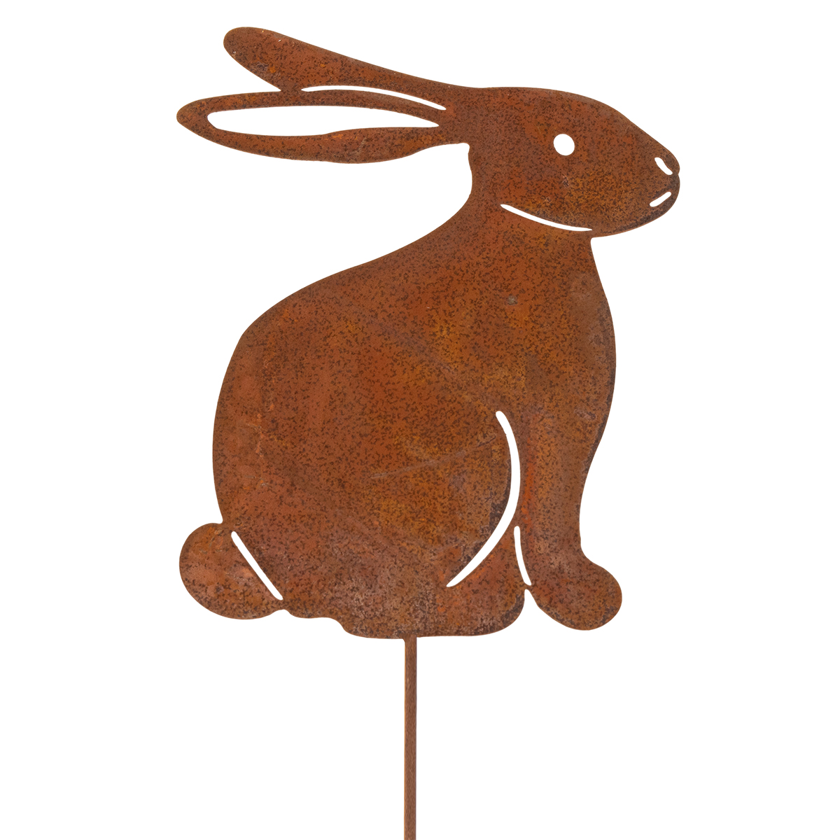 Hagestangkaninen er laget av robust metall med en naturlig rustpatina. Dette gir den ikke bare et behagelig varmt utseende, men gjør den også spesielt værbestandig og slitesterk. Med en høyde på 100 cm og en bredde på 23 cm sitter kaninen på toppen av en solid stake som enkelt kan settes inn i jord eller andre overflater. Takket være det rustne utseendet er den spesielt godt egnet for hager med et rustikk eller vintage-preg.