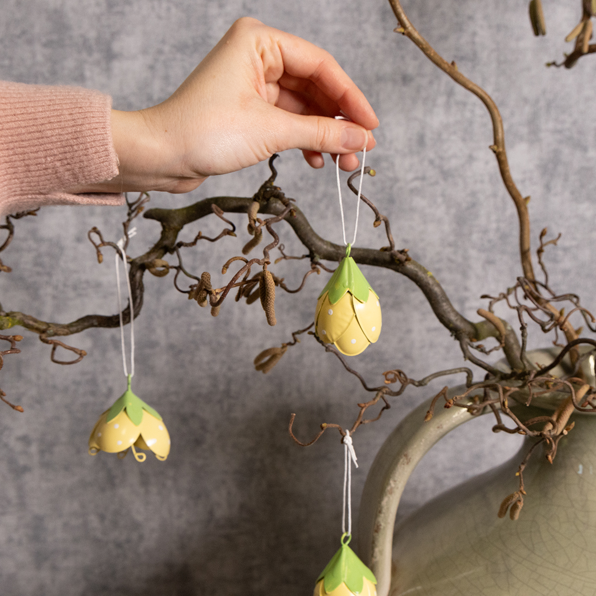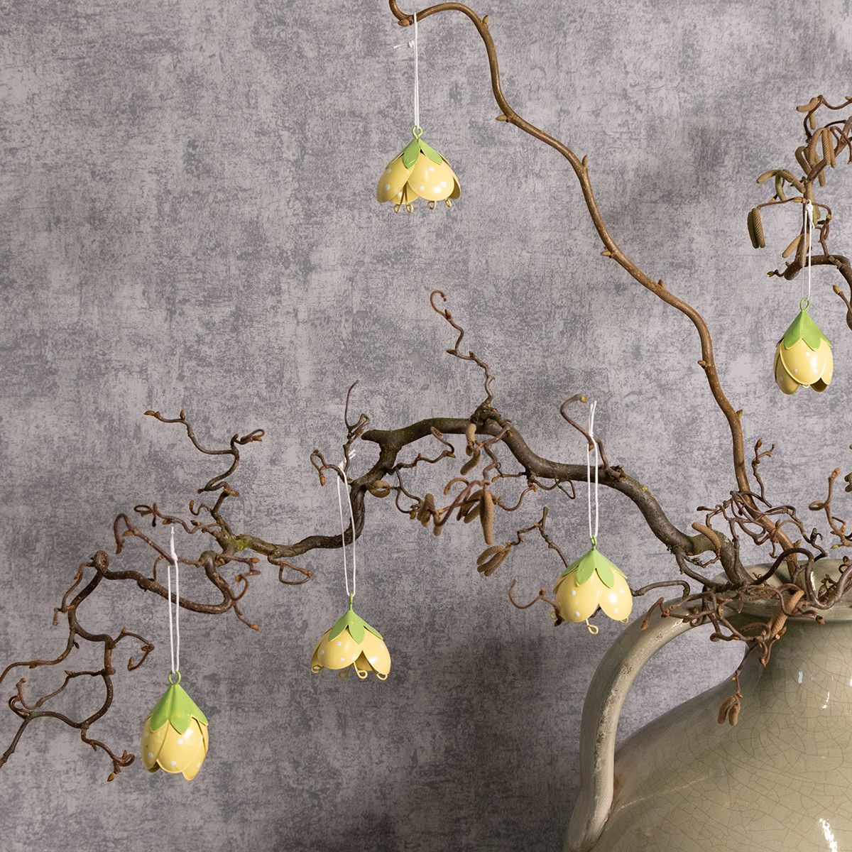 Disse hengende metallblomstene er ideelle for alle som elsker lekne og romantiske dekorasjoner. Med en høyde på 6 cm og en diameter på 4 cm er de ikke for store, men likevel et stilig blikkfang. De delikate gule og grønne fargene skaper et friskt utseende og integreres vakkert i en rekke stiler – fra landlig stil og shabby chic til klassiske blomsteroppsatser. Takket være den høykvalitets metallkonstruksjonen er blomstene robuste og egnet for både innendørs og utendørs bruk. De ser spesielt sjarmerende ut i en entré, hvor de ønsker gjester velkommen med et muntert preg.