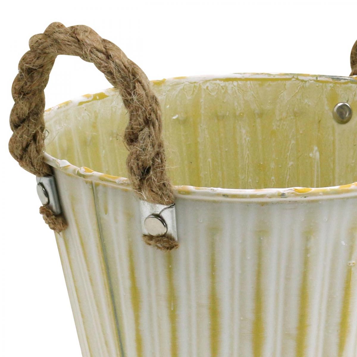 Denne potten laget av metall er perfekt for vårdekorasjoner: i pastellgul kommer plantekassen med håndtak laget av jutesnor vasket hvit i trendy shabby chic.