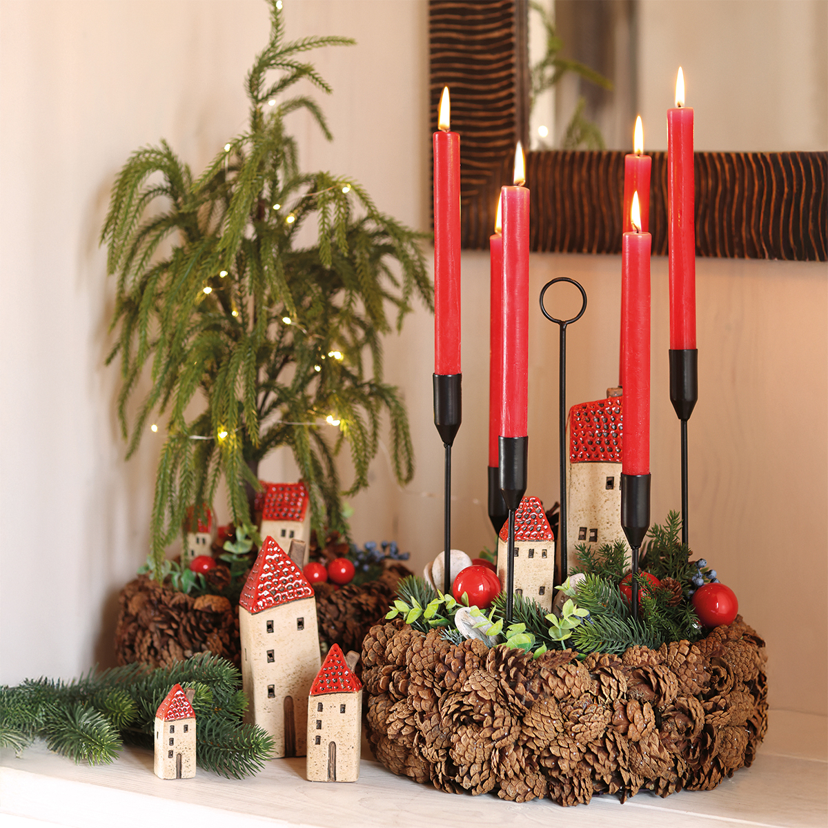 - Lag et festlig adventsarrangement ved å kombinere lysholderen med grangrener og små dekorative figurer fra Floristik24-serien.