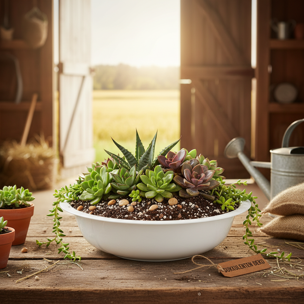 Dekorskålen egner seg ikke bare til planting (det er best å dekke blomsterskålen med folie), men også til bordopplegg som du gjerne vil gi et litt rustikk preg.