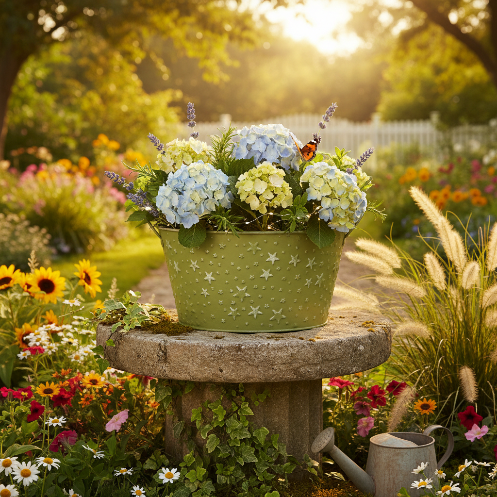 - Multifunksjonell bruk som dekorativ metallskål eller plantekasse