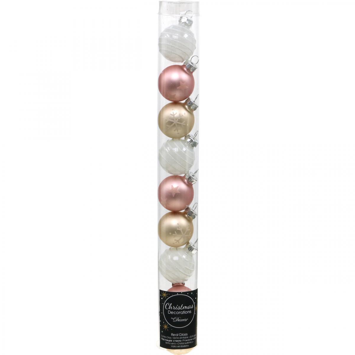 Produktnavn: Mini julekuler krem, rosa, hvit ekte glass Ø3cm 9stk