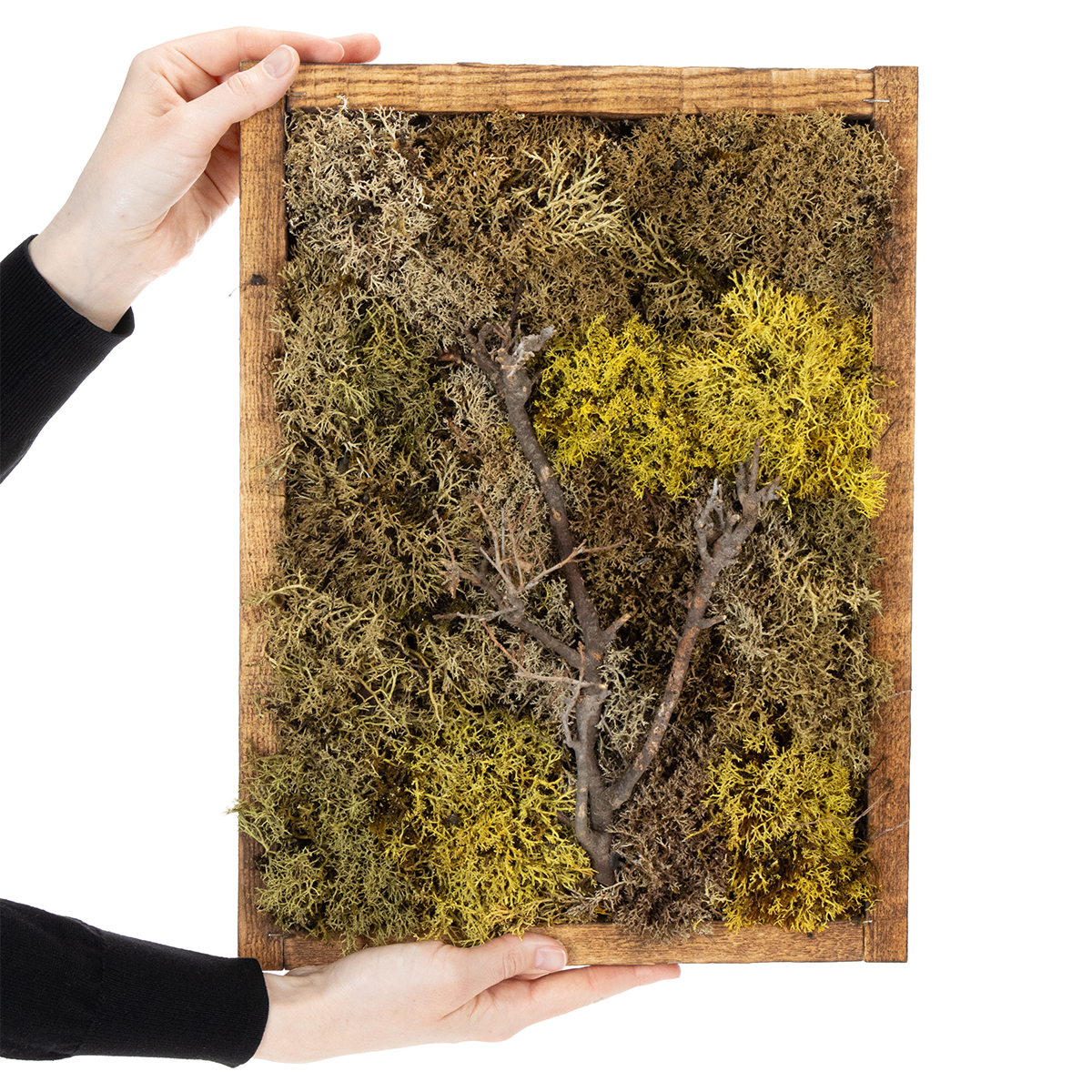 Oppdag den beroligende effekten av ekte mose i en stilig ramme. Vårt bevarte mosebilde er den perfekte grønne veggdekorasjonen for ethvert rom - enten det er en stue, kontor eller meditasjonsrom. Med et unikt mønster av pinnsvinmose i ulike nyanser av grønt og et sentralt grenmotiv, vil mosekunstverket være et blikkfang i ditt interiør.
