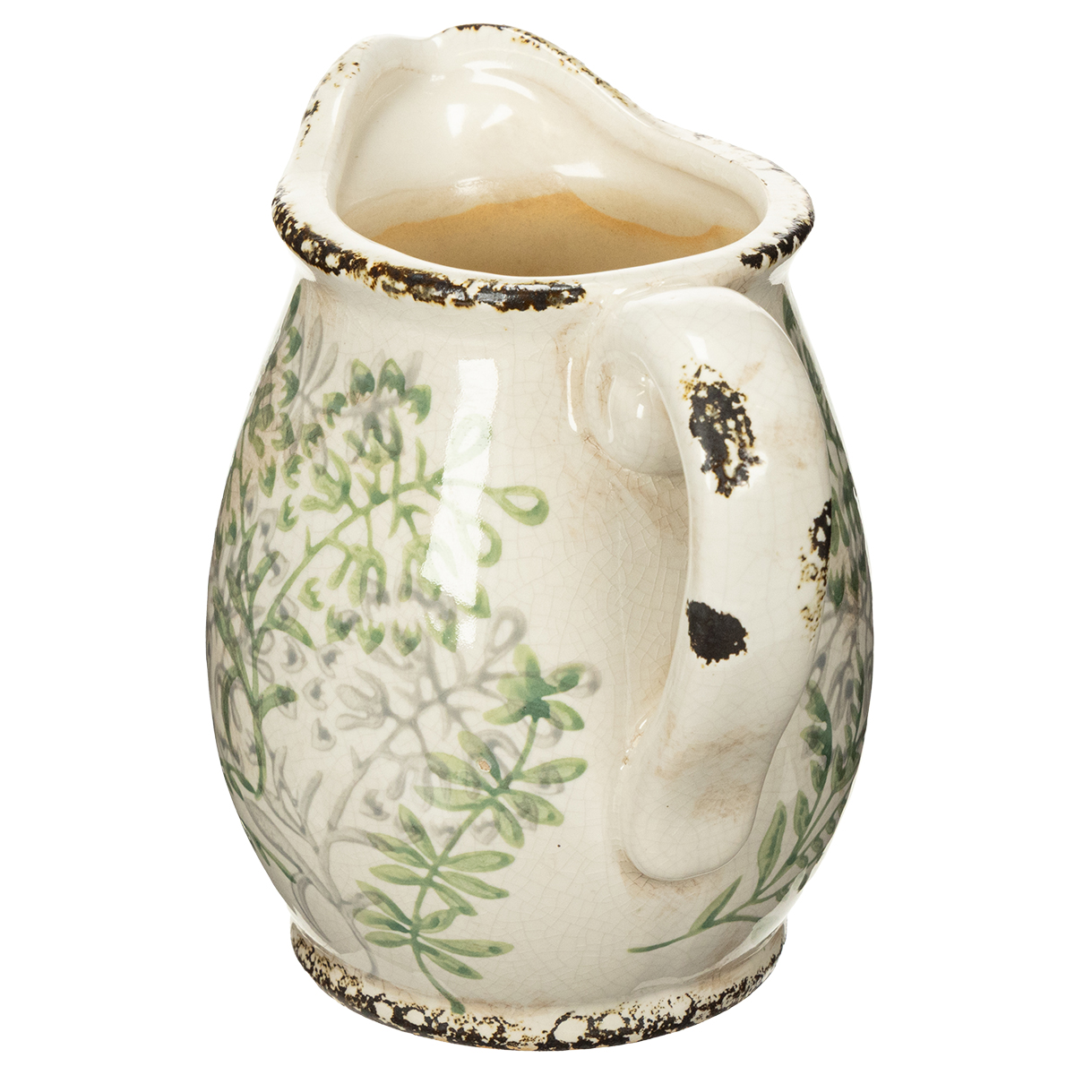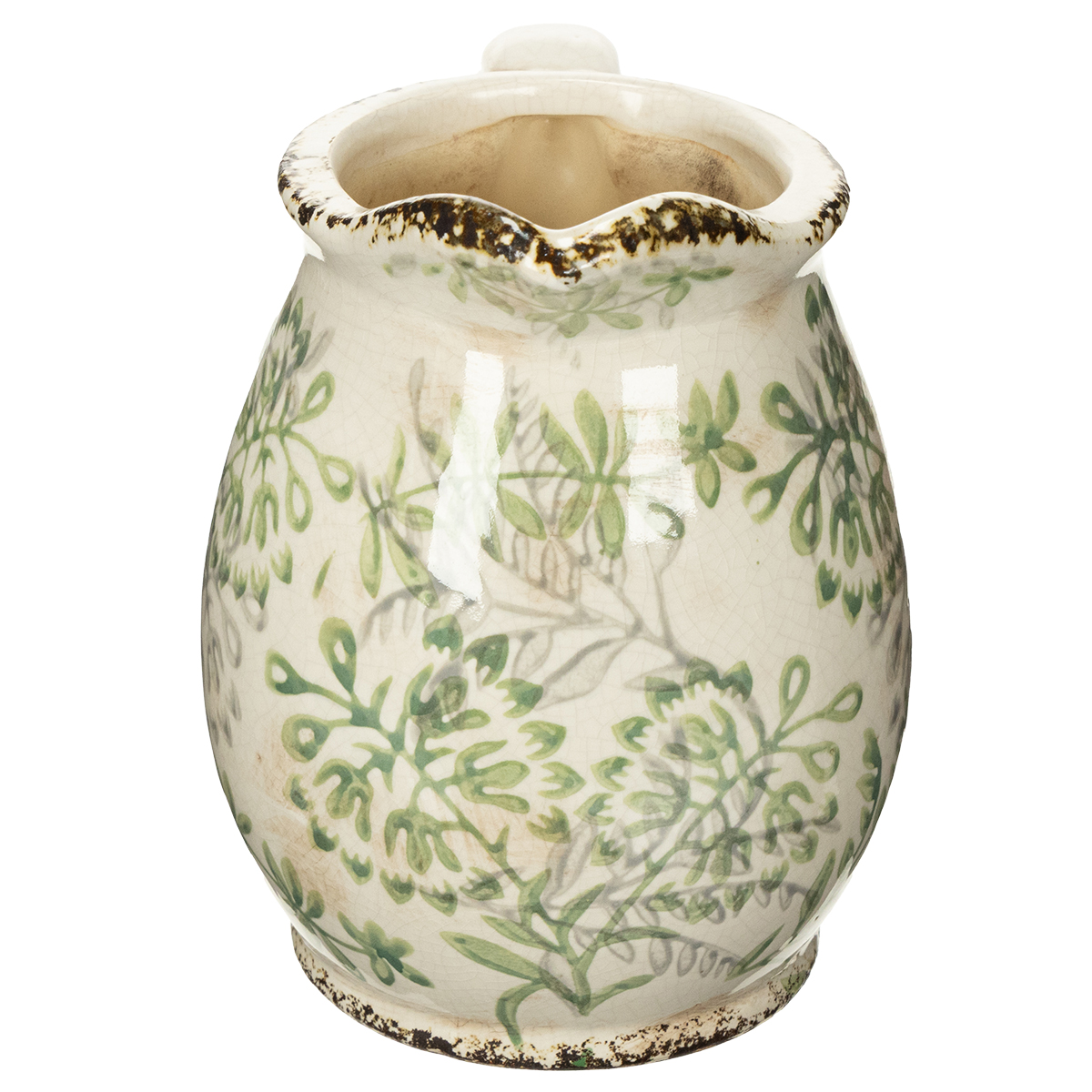 Denne vintage plantebare kannen er en ekte allrounder når det gjelder dekorasjon. Med sin tidløse form, rustikke finish og sjarmerende detaljer, passer den perfekt inn i ethvert hjem i landlig stil. Du kan bruke den som en dekorativ blomsterpotte som sjarmerende viser frem plantene dine. Se for deg denne keramikkmuggen på et lite stuebord, fylt med friske blomster. Målene – 16 cm høye med en diameter på 13 cm – gjør den ideell for mindre arrangementer uten å virke rotete. For et mer naturlig utseende kan du plante den med friske urter. Basilikum, persille eller rosmarin vil finne et stilig hjem her, enten på kjøkkenet eller på terrassen. Kombinasjonen av hvitt og grønt skaper en harmonisk effekt og bringer et friskt pust til innredningen din. Denne nostalgiske blomsterpottekannen passer spesielt godt sammen med andre rustikke elementer, som tremøbler eller shabby chic-tekstiler. Den er også en flott gaveidé, enten for planteelskere eller fans av landlig stil.