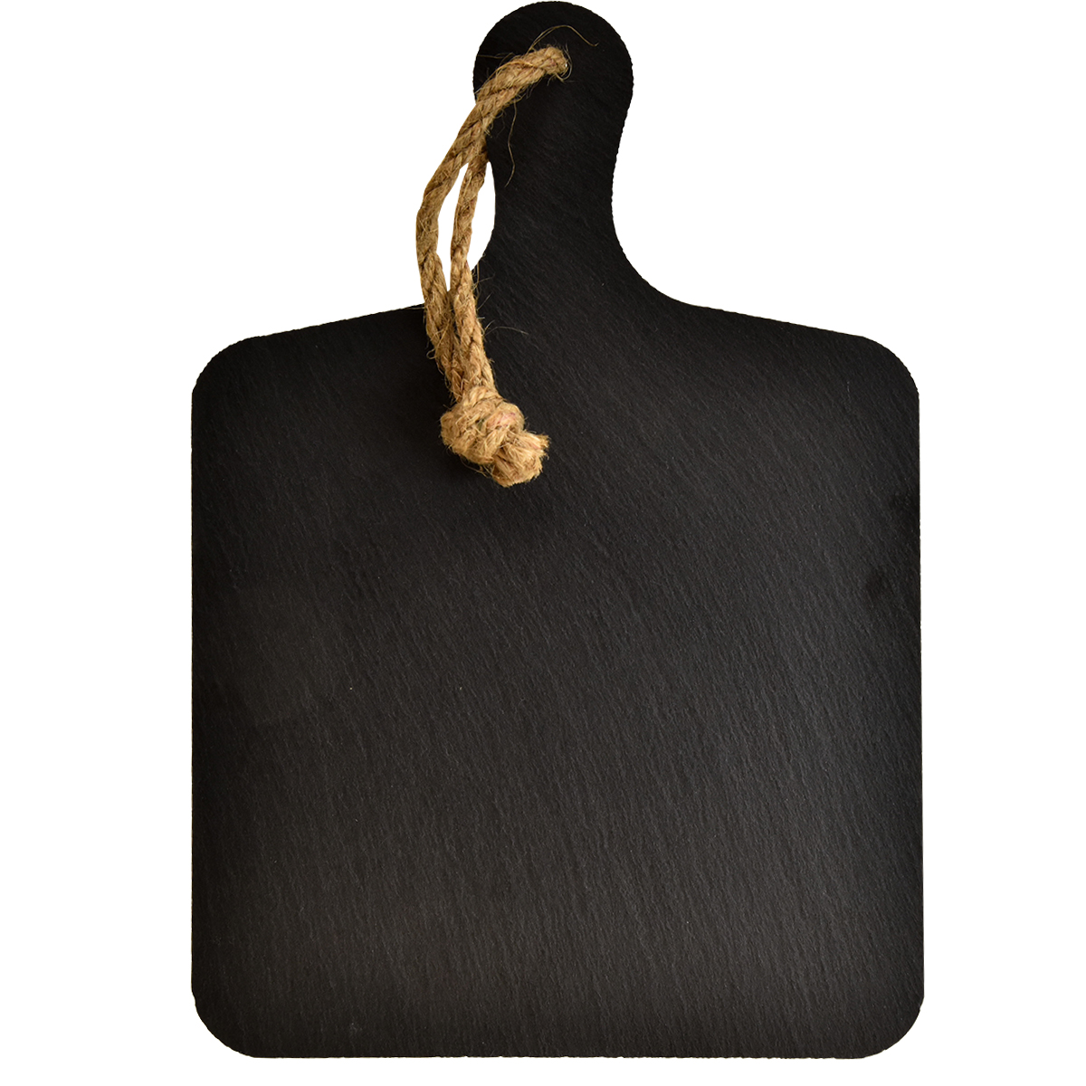 Naturskiferplaten kommer med et boret håndtak. Skiferbrettet er utstyrt med rustikk jutesnor for oppheng. Det betyr at natursteinskuffen kan legges, lenes mot veggen eller henges dekorativt. Skiferpaneler kan også skrives herlig på - bruk krittpenner til dette formålet eller permanente eller akrylpenner for permanent dekorasjon.