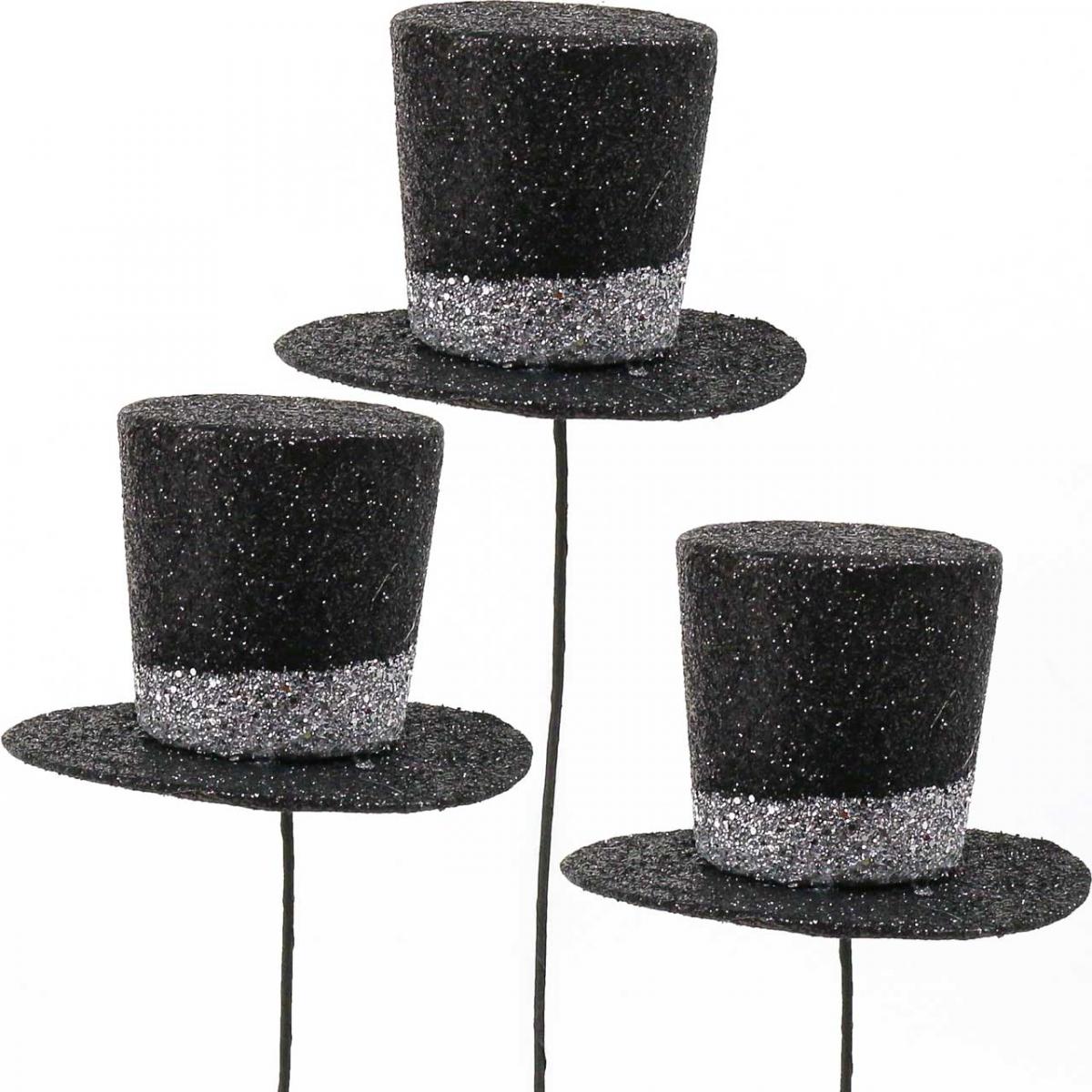 De sorte toppluene har en elegant sølvstripe rundt hattekanten. De sølv- og svarte delene av sylindrene er dekket av glitter og glitter og glitrer deretter.