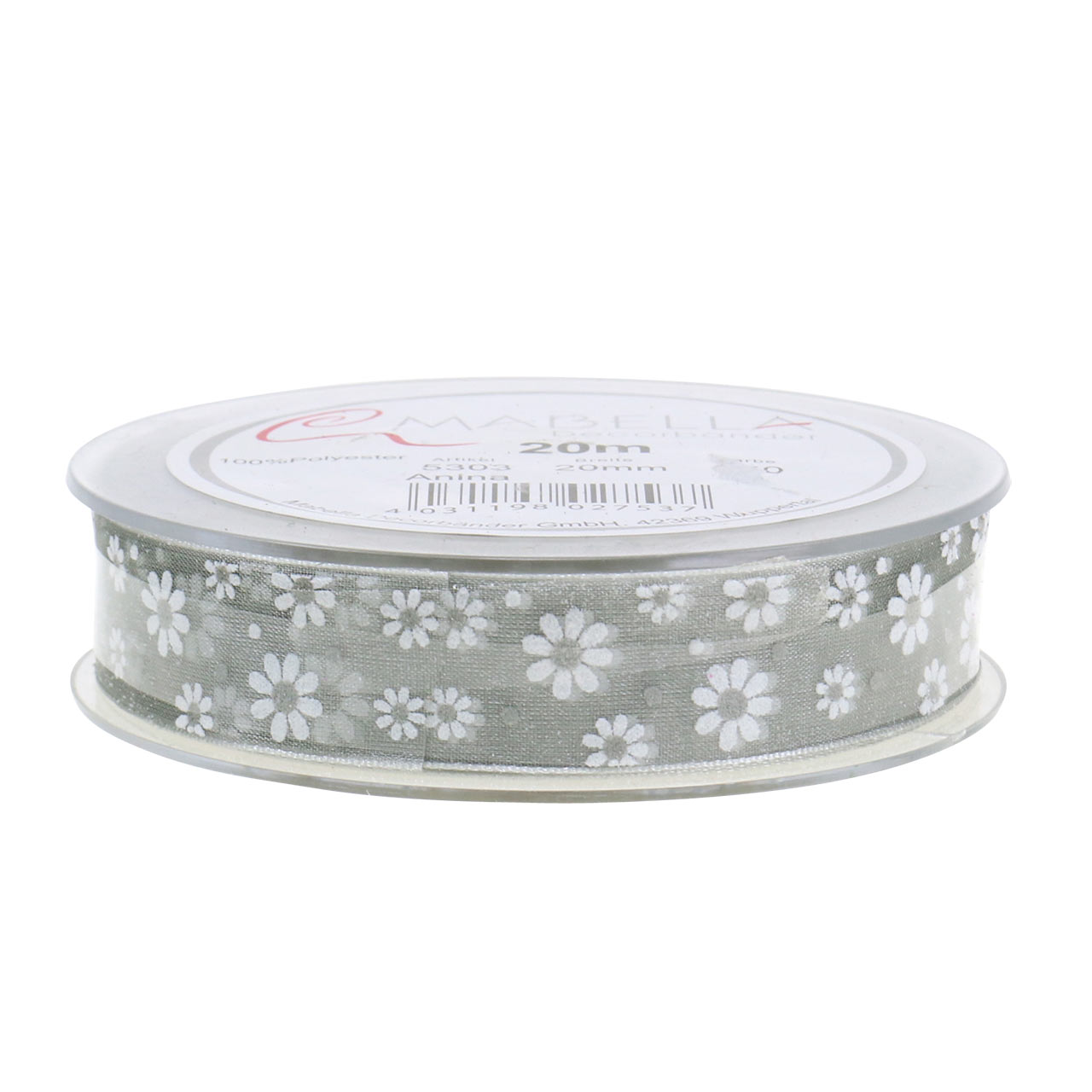 Det grå organzabåndet med det hvite blomstermønsteret er tilgjengelig på en plastrulle og er rundt 20 meter langt og rundt 20 millimeter bredt.