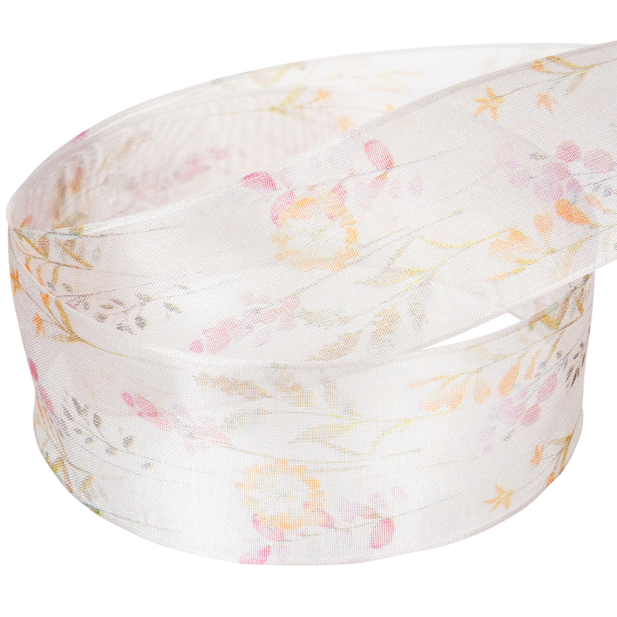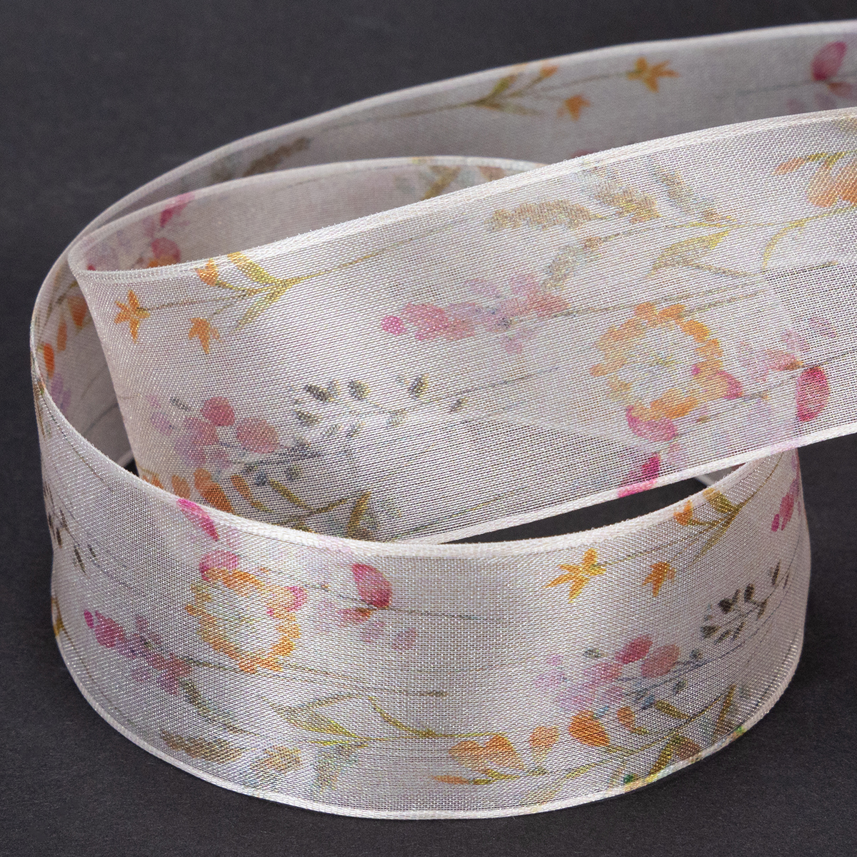 Med den silkeaktige skimmeren som er typisk for organzastoff og det subtile fargevalget mellom rosa, aprikos og oransje, ser blomster- og plantemotivene ut som de kommer fra en japansk hage. Like velduftende og delikat som båndet ser ut, gir formbevarende kanter deg mulighet til å knytte sløyfer som ser ut akkurat som du håpet!
