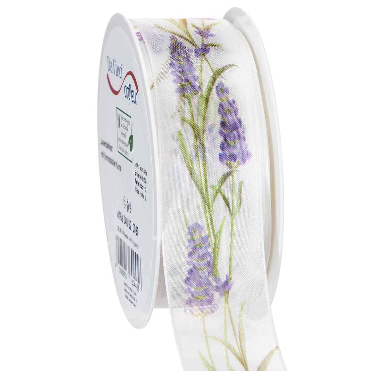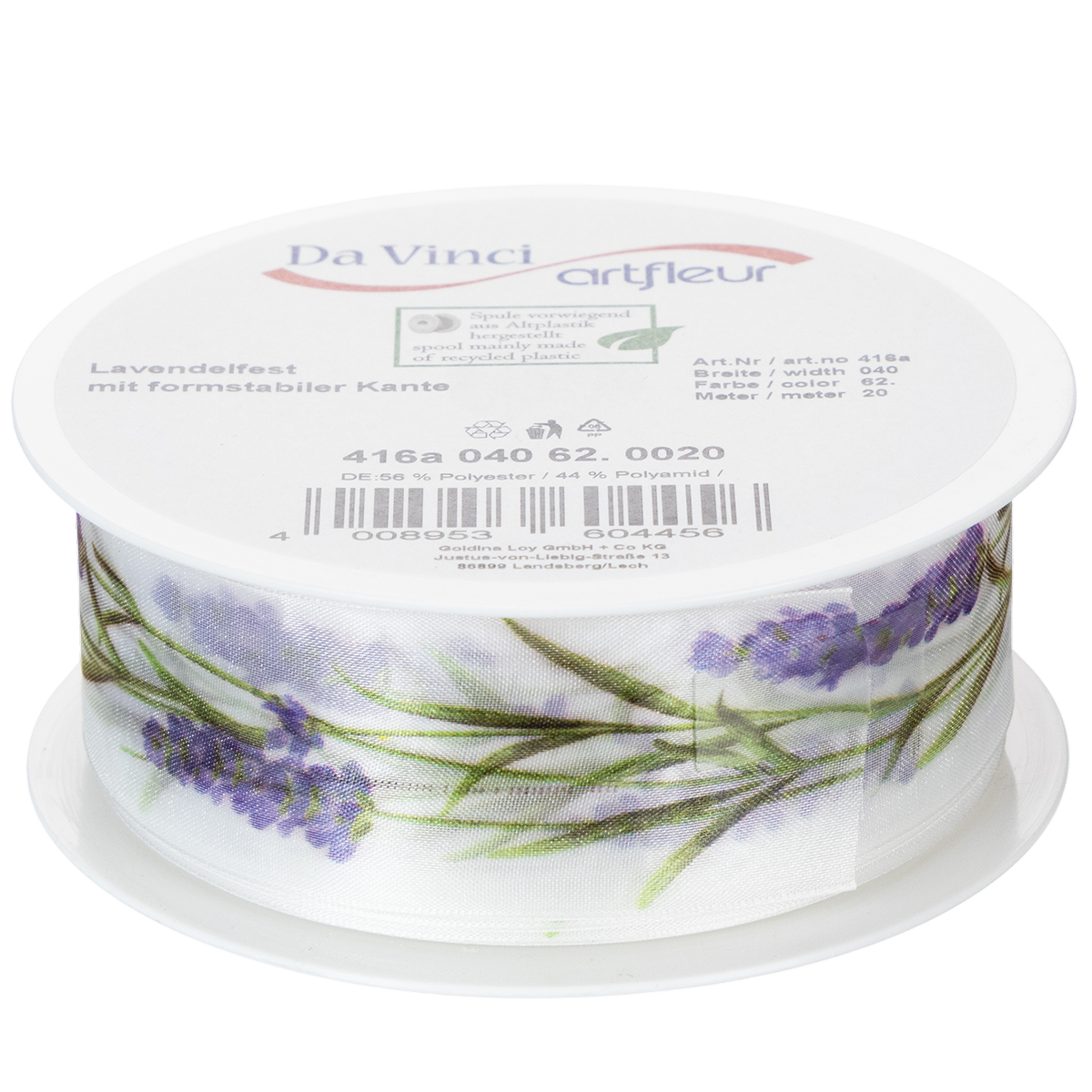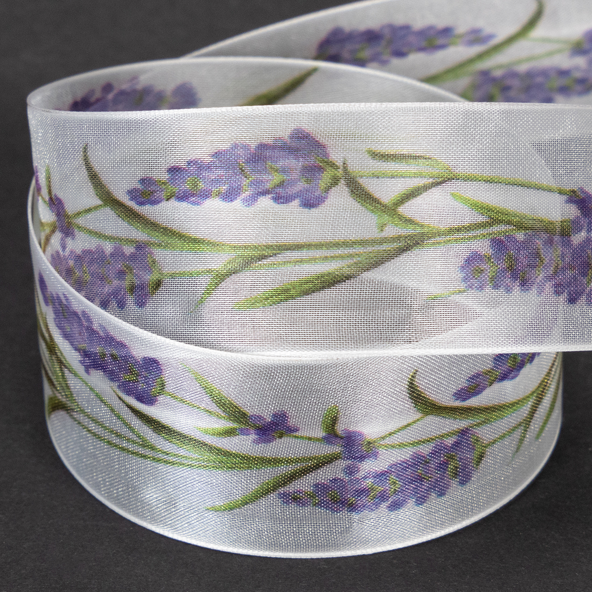 Lavendelmotivet ser friskt og fargerikt ut på den hvite bakgrunnen til organzabåndet. Med sin gjennomsiktige organzavev er chiffonbåndet lett og har en karakteristisk skimmer, mens de formbevarende kantene sørger for at sløyfene ser pittoreske ut.